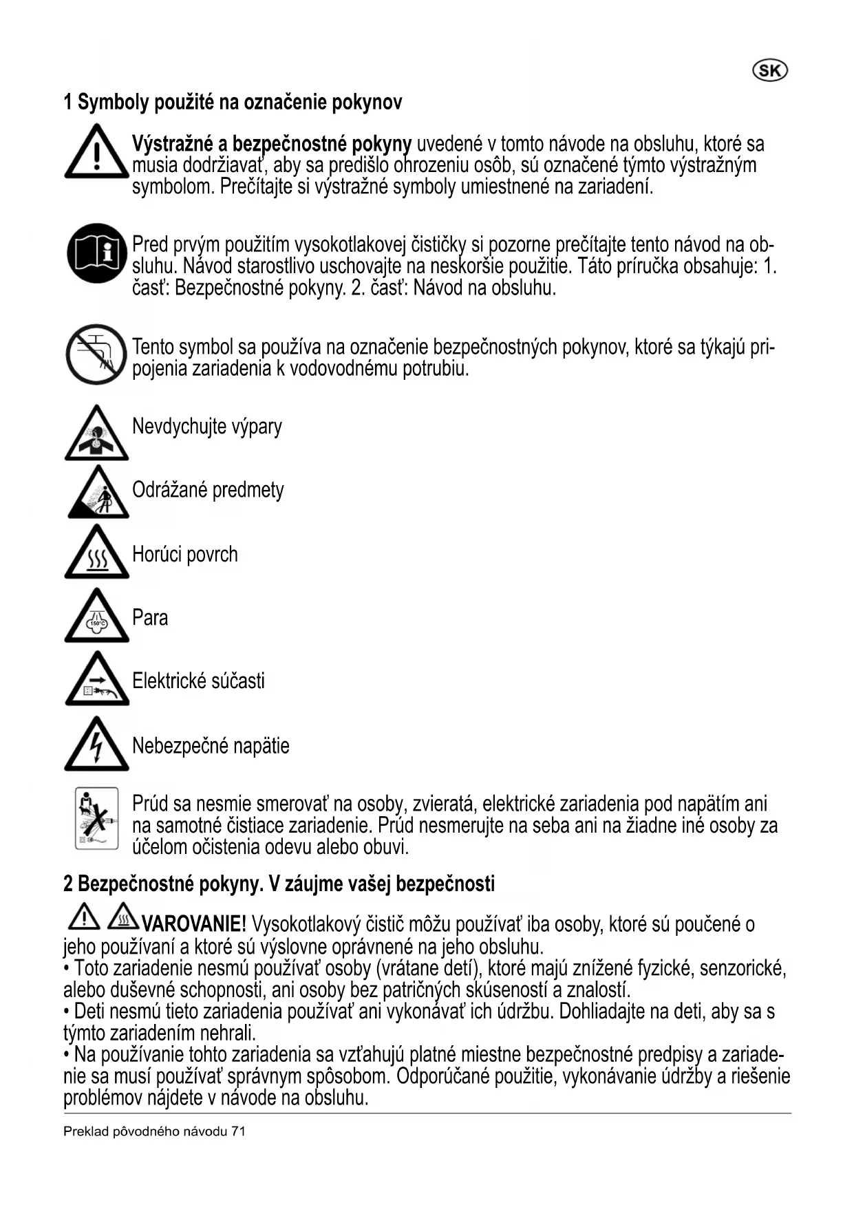 - Ako je kabel napajanja oštećen, mora ga zamijeniti proizvođač, njegov ovlašteni serviser ili kvalificirano osoblje kako bi se izbjegle opasnosti.Preklad pôvodného návodu 71 1 Symboly použité na označenie pokynov Výstražné a bezpečnostné pokyny uvedené v tomto návode na obsluhu, ktoré sa musia dodržiavať, aby sa predišlo ohrozeniu osôb, sú označené týmto výstražným symbolom. Prečítajte si výstražné symboly umiestnené na zariadení. Pred prvým použitím vysokotlakovej čističky si pozorne prečítajte tento návod na ob- sluhu. Návod starostlivo uschovajte na neskoršie použitie. Táto príručka obsahuje: 1. časť: Bezpečnostné pokyny. 2. časť: Návod na obsluhu. Tento symbol sa používa na označenie bezpečnostných pokynov, ktoré sa týkajú pri- pojenia zariadenia k vodovodnému potrubiu. Nevdychujte výpary Odrážané predmety Horúci povrch Para Elektrické súčasti Nebezpečné napätie Prúd sa nesmie smerovať na osoby, zvieratá, elektrické zariadenia pod napätím ani na samotné čistiace zariadenie. Prúd nesmerujte na seba ani na žiadne iné osoby za účelom očistenia odevu alebo obuvi. 2 Bezpečnostné pokyny. V záujme vašej bezpečnosti VAROVANIE! Vysokotlakový čistič môžu používať iba osoby, ktoré sú poučené o jeho používaní a ktoré sú výslovne oprávnené na jeho obsluhu.