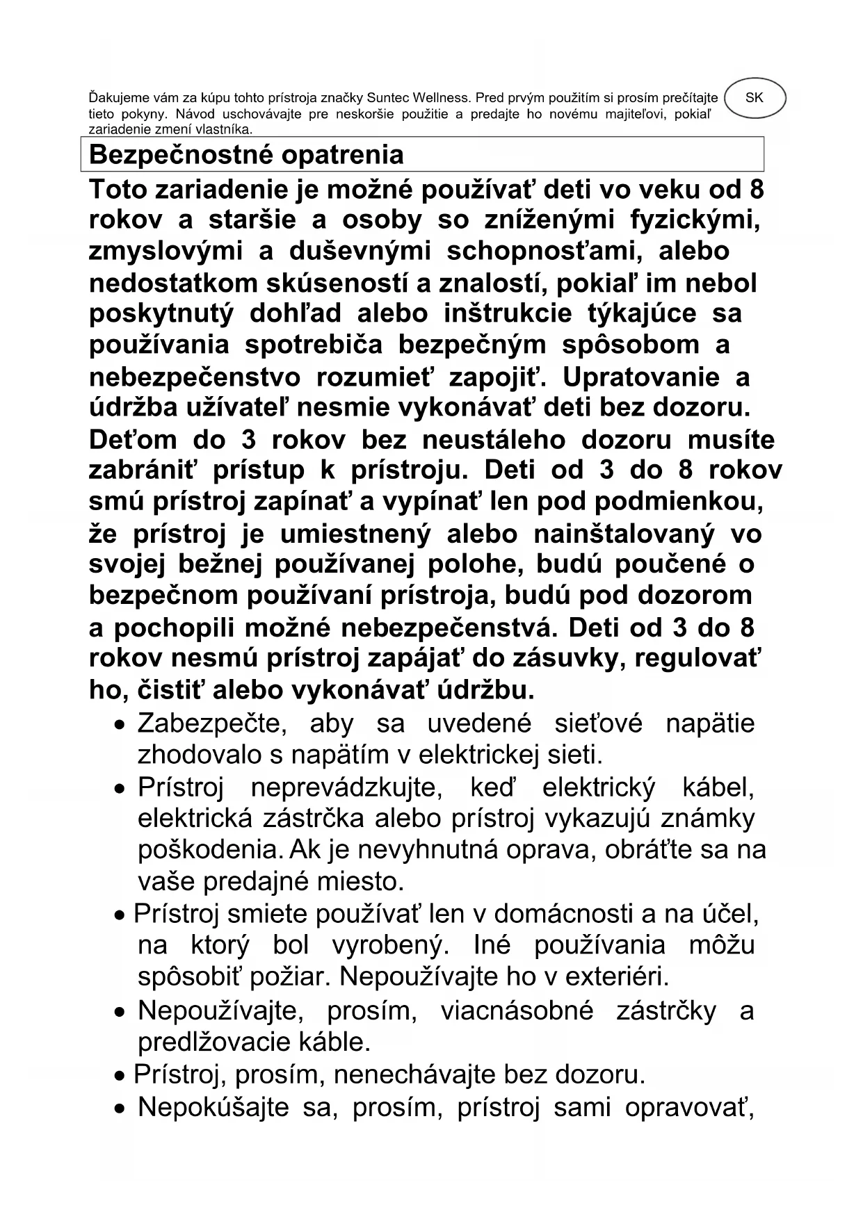 Nazivna napetost 220-240V~ Nazivna frekvenca 50Hz Vhodna moč 15W Sistem delovanja nepretrganĎakujeme vám za kúpu tohto prístroja značky Suntec Wellness. Pred prvým použitím si prosím prečítajte tieto pokyny. Návod uschovávajte pre neskoršie použitie a predajte ho novému majiteľovi, pokiaľ zariadenie zmení vlastníka. Bezpečnostné opatrenia Toto zariadenie je možné používať deti vo veku od 8 rokov a staršie a osoby so zníženými fyzickými, zmyslovými a duševnými schopnosťami, alebo nedostatkom skúseností a znalostí, pokiaľ im nebol poskytnutý dohľad alebo inštrukcie týkajúce sa používania spotrebiča bezpečným spôsobom a nebezpečenstvo rozumieť zapojiť. Upratovanie a údržba užívateľ nesmie vykonávať deti bez dozoru. Deťom do 3 rokov bez neustáleho dozoru musíte zabrániť prístup k prístroju. Deti od 3 do 8 rokov smú prístroj zapínať a vypínať len pod podmienkou, že prístroj je umiestnený alebo nainštalovaný vo svojej bežnej používanej polohe, budú poučené o bezpečnom používaní prístroja, budú pod dozorom a pochopili možné nebezpečenstvá. Deti od 3 do 8 rokov nesmú prístroj zapájať do zásuvky, regulovať ho, čistiť alebo vykonávať údržbu.