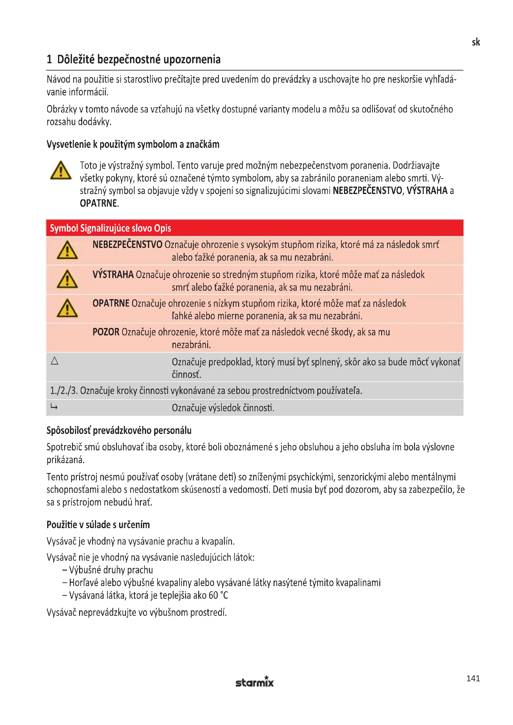 Označuje výsledok činnos. Spôsobilosť prevádzkového personálu Spotrebič smú obsluhovať iba osoby, ktoré boli oboznámené s jeho obsluhou a jeho obsluha ím bola výslovne prikázaná. Tento prístroj nesmú používať osoby (vrátane de) so zníženými psychickými, senzorickými alebo mentálnymi schopnosťami alebo s nedostatkom skúsenos a vedomos. De musia byť pod dozorom, aby sa zabezpečilo, že sa s prístrojom nebudú hrať. Použie v súlade s určením Vysávač je vhodný na vysávanie prachu a kvapalín. Vysávač nie je vhodný na vysávanie nasledujúcich látok: – Výbušné druhy prachu – Horľavé alebo výbušné kvapaliny alebo vysávané látky nasýtené týmito kvapalinami – Vysávaná látka, ktorá je teplejšia ako 60 °C Vysávač neprevádzkujte vo výbušnom prostredí. 790749_112015_V03_GA_NSG.indb 141 28.01.2016 09:41:37142