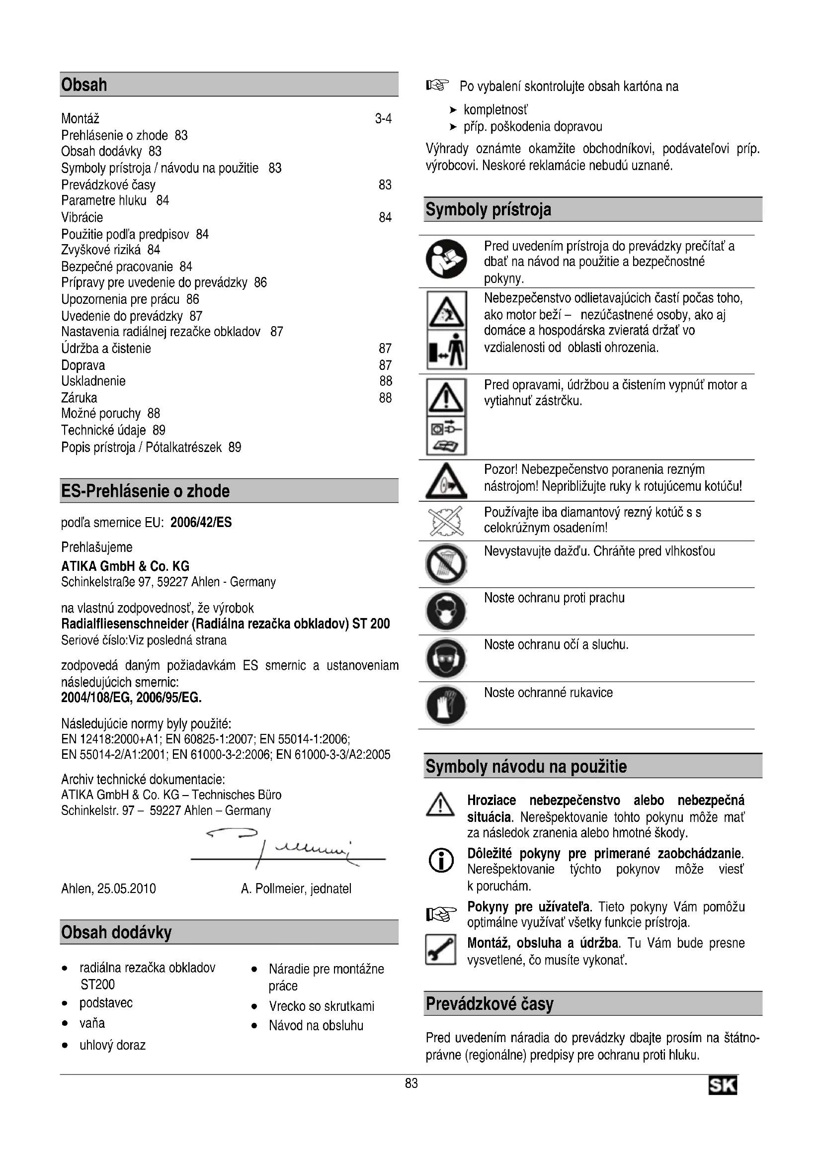 Obsah Montáž 3-4 Prehlásenie o zhode 83 Obsah dodávky 83 Symboly prístroja / návodu na použitie 83 Prevádzkové časy 83 Parametre hluku 84 Vibrácie 84 Použitie podľa predpisov 84 Zvyškové riziká 84 Bezpečné pracovanie 84 Prípravy pre uvedenie do prevádzky 86 Upozornenia pre prácu 86 Uvedenie do prevádzky 87 Nastavenia radiálnej rezačke obkladov 87 Údržba a čistenie 87 Doprava 87 Uskladnenie 88 Záruka 88 Možné poruchy 88 Technické údaje 89 Popis prístroja / Pótalkatrészek 89