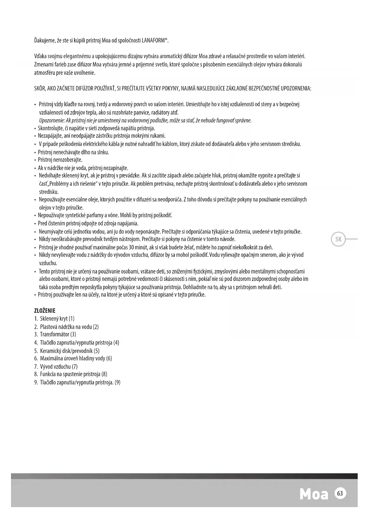 Ďakujeme, že ste si kúpili prístroj Moa od spoločnosti LANAFORM®. Vďaka svojmu elegantnému a upokojujúcemu dizajnu vytvára aromatický difúzor Moa zdravé a relaxačné prostredie vo vašom interiéri. Zmenami farieb zase difúzor Moa vytvára jemné a príjemné svetlo, ktoré spoločne s pôsobením esenciálnych olejov vytvára dokonalú atmosféru pre vaše uvoľnenie. SKÔR, AKO ZAČNETE DIFÚZOR POUŽÍVAŤ, SI PREČÍTAJTE VŠETKY POKYNY, NAJMÄ NASLEDUJÚCE ZÁKLADNÉ BEZPEČNOSTNÉ UPOZORNENIA: