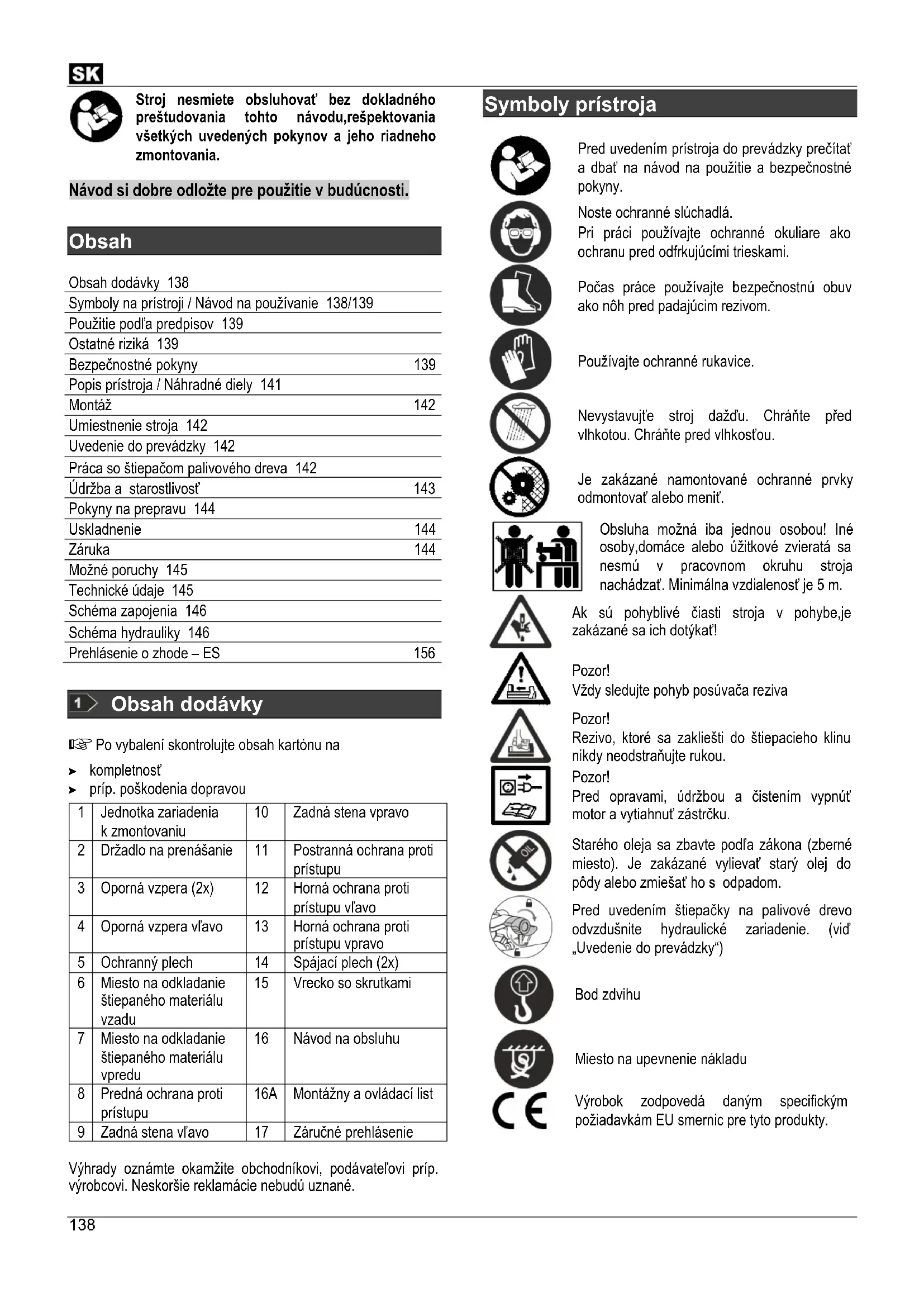 Obsah Obsah dodávky 138 Symboly na prístroji / Návod na používanie 138/139 Použitie podľa predpisov 139 Ostatné riziká 139 Bezpečnostné pokyny 139 Popis prístroja / Náhradné diely 141 Montáž 142 Umiestnenie stroja 142 Uvedenie do prevádzky 142 Práca so štiepačom palivového dreva 142 Údržba a starostlivosť 143 Pokyny na prepravu 144 Uskladnenie 144 Záruka 144 Možné poruchy 145 Technické údaje 145 Schéma zapojenia 146 Schéma hydrauliky 146 Prehlásenie o zhode – ES 156