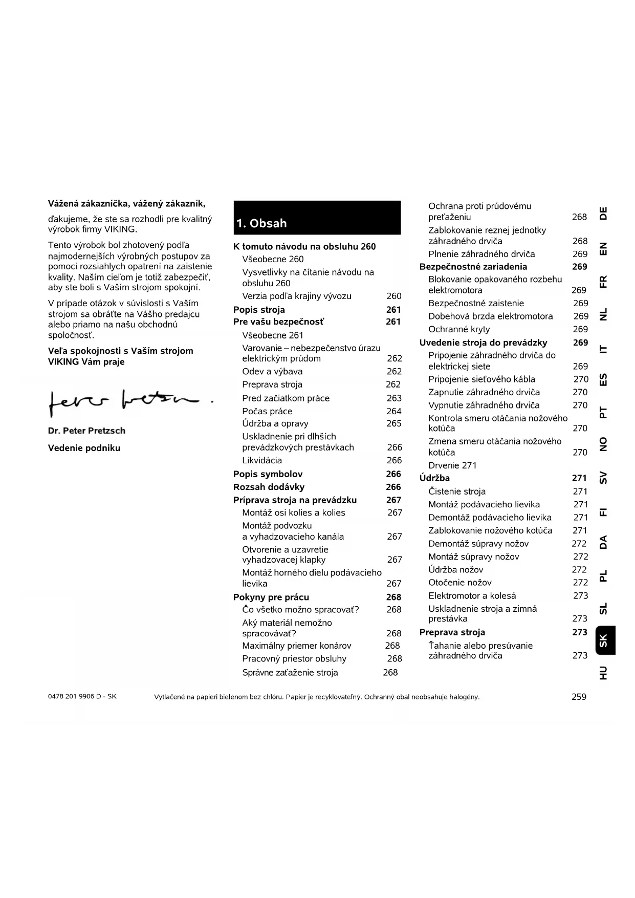 DEENFRNLITESPTNOSVFIDAPLSLHU SK 0478 201 9906 D - SK Vážená zákazníčka, vážený zákazník, ďakujeme, že ste sa rozhodli pre kvalitný výrobok firmy VIKING. Tento výrobok bol zhotovený podľa najmodernejších výrobných postupov za pomoci rozsiahlych opatrení na zaistenie kvality. Naším cieľom je totiž zabezpečiť, aby ste boli s Vaším strojom spokojní. V prípade otázok v súvislosti s Vaším strojom sa obráťte na Vášho predajcu alebo priamo na našu obchodnú spoločnosť. Veľa spokojnosti s Vaším strojom VIKING Vám praje Vedenie podniku Vytlačené na papieri bielenom bez chlóru. Papier je recyklovateľný. Ochranný obal neobsahuje halogény.