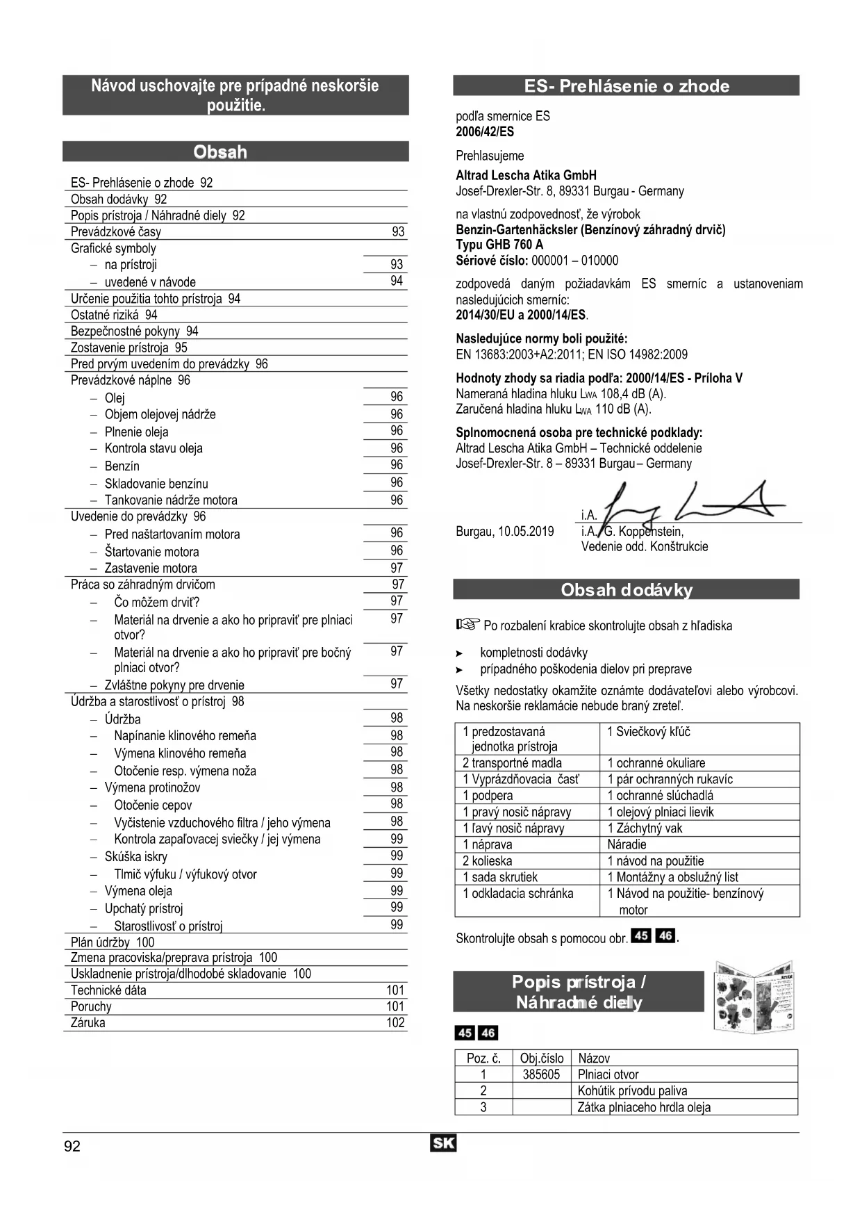 podľa smernice ES 2006/42/ES Prehlasujeme Altrad Lescha Atika GmbH Josef-Drexler-Str. 8, 89331 Burgau - Germany na vlastnú zodpovednosť, že výrobok Benzin-Gartenhäcksler (Benzínový záhradný drvič) Typu GHB 760 A Sériové číslo: 000001 – 010000 zodpovedá daným požiadavkám ES smerníc a ustanoveniam nasledujúcich smerníc: 2014/30/EU a 2000/14/ES. Nasledujúce normy boli použité: