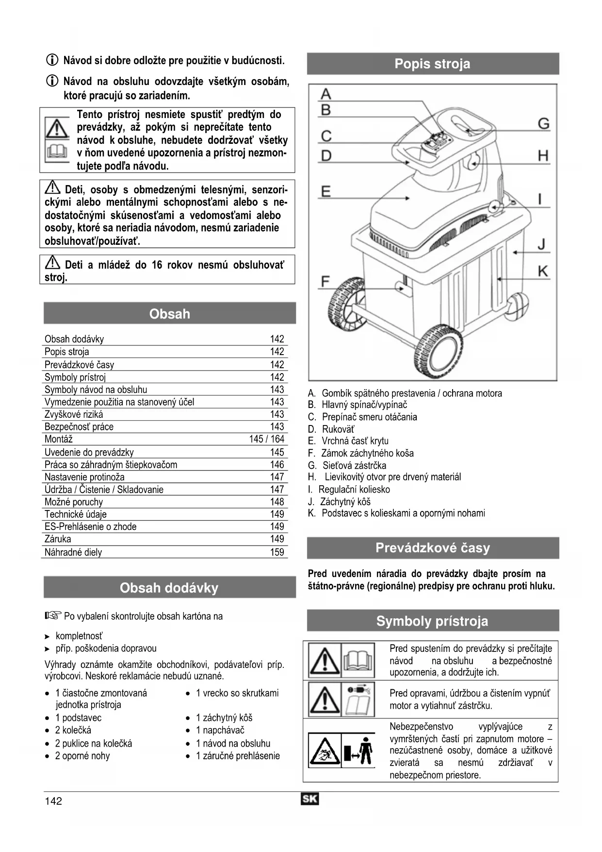 Vymedzenie použitia na stanovený účel Za použitie na stanovený účel sa považuje štiepkovanie - konárov každého druhu do maximálneho priemeru (v závislosti od druhu dreva a jeho čerstvosti) - zvädnutého, vlhkého, niekoľko dní skladovaného záhradného odpadu striedavo s konármi Drvenie skla, kovu, plastových dielov, plastových vreciek, kameňov, látkového odpadu, koreňov v pôde, odpadu bez pevnej konzistencie (napr. odpadu z kuchyne) je výslovne vylúčené. Záhradný štiepkovač je vhodný iba pre privátne použitie v záhrade okolo domu alebo v záhradke. Za štiepkovače pre súkromnú domovú a hobby záhradu sa považujú také prístroje, ktoré nie sú nasadzované vo verejných zariadeniach, parkoch, športoviskách ani v poľnohospodárstve a lesohospodárstve. K použitiu na stanovený účel patrí aj dodržiavanie výrobcom predpísaných podmienok pre prevádzku, údržbu a opravy a dodržiavanie bezpečnostných predpisov uvedených v návode. Každé ďalšie iné použitie platí ako použitie, ktoré nie je v súlade so stanoveným účelom. Za škody každého druhu, ktoré z toho vyplynú, výrobca neručí. Riziko nesie sám užívateľ. Svojvoľné zmeny na stroji sú neprípustné a vylučujú všetky ručenia výrobcu za takto spôsobené škody. Nástroj môžu pripravovať, používať a vykonávať na ňom údržbu iba osoby, ktoré sú s ním oboznámené a poučené o nebezpečenstvách vyplývajúcich z jeho používania. Opravárske práce smieme prevádzať len my, príp. nami menované servisné miesta.