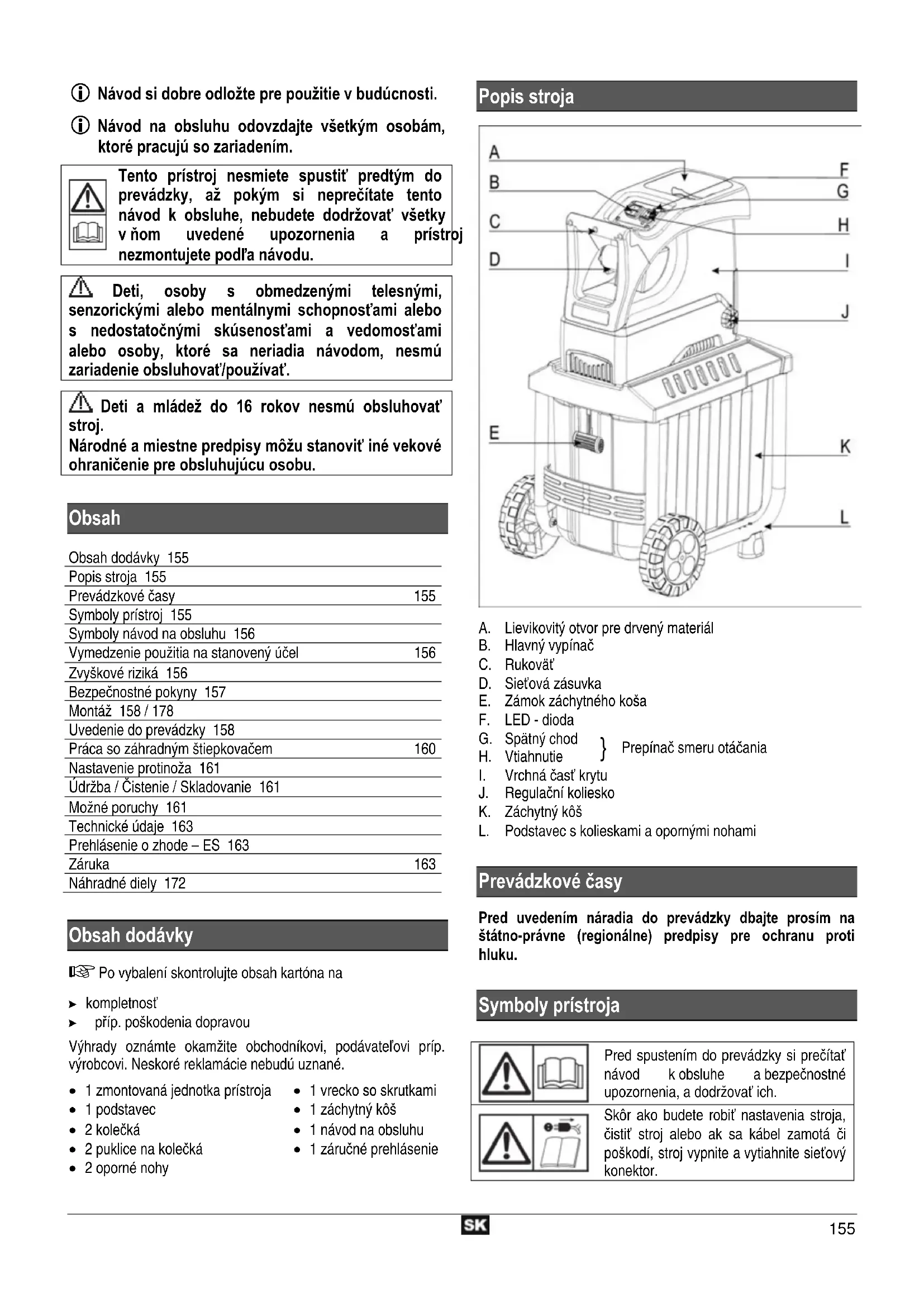 Obsah Obsah dodávky 155 Popis stroja 155 Prevádzkové časy 155 Symboly prístroj 155 Symboly návod na obsluhu 156 Vymedzenie použitia na stanovený účel 156 Zvyškové riziká 156 Bezpečnostné pokyny 157 Montáž 158 / 178 Uvedenie do prevádzky 158 Práca so záhradným štiepkovačem 160 Nastavenie protinoža 161 Údržba / Čistenie / Skladovanie 161 Možné poruchy 161 Technické údaje 163 Prehlásenie o zhode – ES 163 Záruka 163 Náhradné diely 172