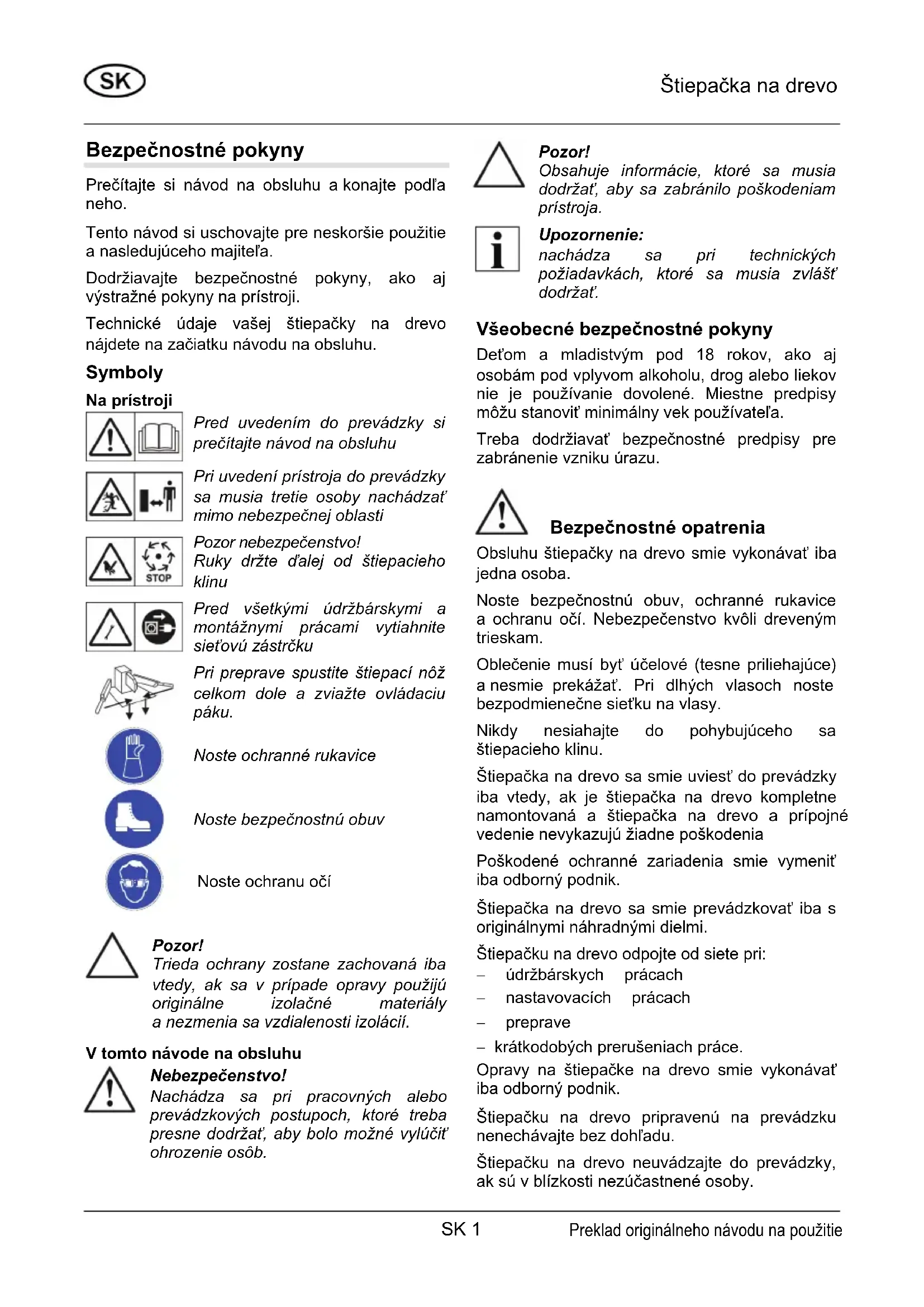 Pozor! Trieda ochrany zostane zachovaná iba vtedy, ak sa v prípade opravy použijú originálne izolačné materiály a nezmenia sa vzdialenosti izolácií. V tomto návode na obsluhu Nebezpečenstvo! Nachádza sa pri pracovných alebo prevádzkových postupoch, ktoré treba presne dodržať, aby bolo možné vylúčiť ohrozenie osôb. Pozor! Obsahuje informácie, ktoré sa musia dodržať, aby sa zabránilo poškodeniam prístroja. Upozornenie: nachádza sa pri technických požiadavkách, ktoré sa musia zvlášť dodržať. Všeobecné bezpečnostné pokyny Deťom a mladistvým pod 18 rokov, ako aj osobám pod vplyvom alkoholu, drog alebo liekov nie je používanie dovolené. Miestne predpisy môžu stanoviť minimálny vek používateľa. Treba dodržiavať bezpečnostné predpisy pre zabránenie vzniku úrazu. Bezpečnostné opatrenia Obsluhu štiepačky na drevo smie vykonávať iba jedna osoba. Noste bezpečnostnú obuv, ochranné rukavice a ochranu očí. Nebezpečenstvo kvôli dreveným trieskam. Oblečenie musí byť účelové (tesne priliehajúce) a nesmie prekážať. Pri dlhých vlasoch noste bezpodmienečne sieťku na vlasy. Nikdy nesiahajte do pohybujúceho sa štiepacieho klinu. Štiepačka na drevo sa smie uviesť do prevádzky iba vtedy, ak je štiepačka na drevo kompletne namontovaná a štiepačka na drevo a prípojné vedenie nevykazujú žiadne poškodenia Poškodené ochranné zariadenia smie vymeniť iba odborný podnik. Štiepačka na drevo sa smie prevádzkovať iba s originálnymi náhradnými dielmi. Štiepačku na drevo odpojte od siete pri: − údržbárskych prácach − nastavovacích prácach − preprave − krátkodobých prerušeniach práce. Opravy na štiepačke na drevo smie vykonávať iba odborný podnik. Štiepačku na drevo pripravenú na prevádzku nenechávajte bez dohľadu. Štiepačku na drevo neuvádzajte do prevádzky, ak sú v blízkosti nezúčastnené osoby. Preklad originálneho návodu na použitieŠtiepačka na drevo SK 2 Štiepačku na drevo neobsluhujte pri daždi, nenechajte ju stáť v daždi, ani na ňu nestriekajte vodu. Nebezpečenstvo úrazu elektrickým prúdom. V pracovnej oblasti štiepačky na drevo sa nesmú nachádzať žiadne ďalšie osoby. Dávajte pozor na deti a tiež zvieratá. Používateľ prístroja je zodpovedný za úrazy iných osôb alebo škody na ich vlastníctve. V pracovnej oblasti sa nesmú nachádzať kusy dreva a iné predmety – nebezpečenstvo zakopnutia. Bezpečnostné zariadenia Ochranný motorový vypínač Pri preťažení štiepačky na drevo ochranný motorový vypínač vypne motor. Funkcia ochranného motorového vypínača sa nesmie vypnúť. Ak ochranný motorový vypínač vypol štiepačku na drevo, počínajte si nasledovne: