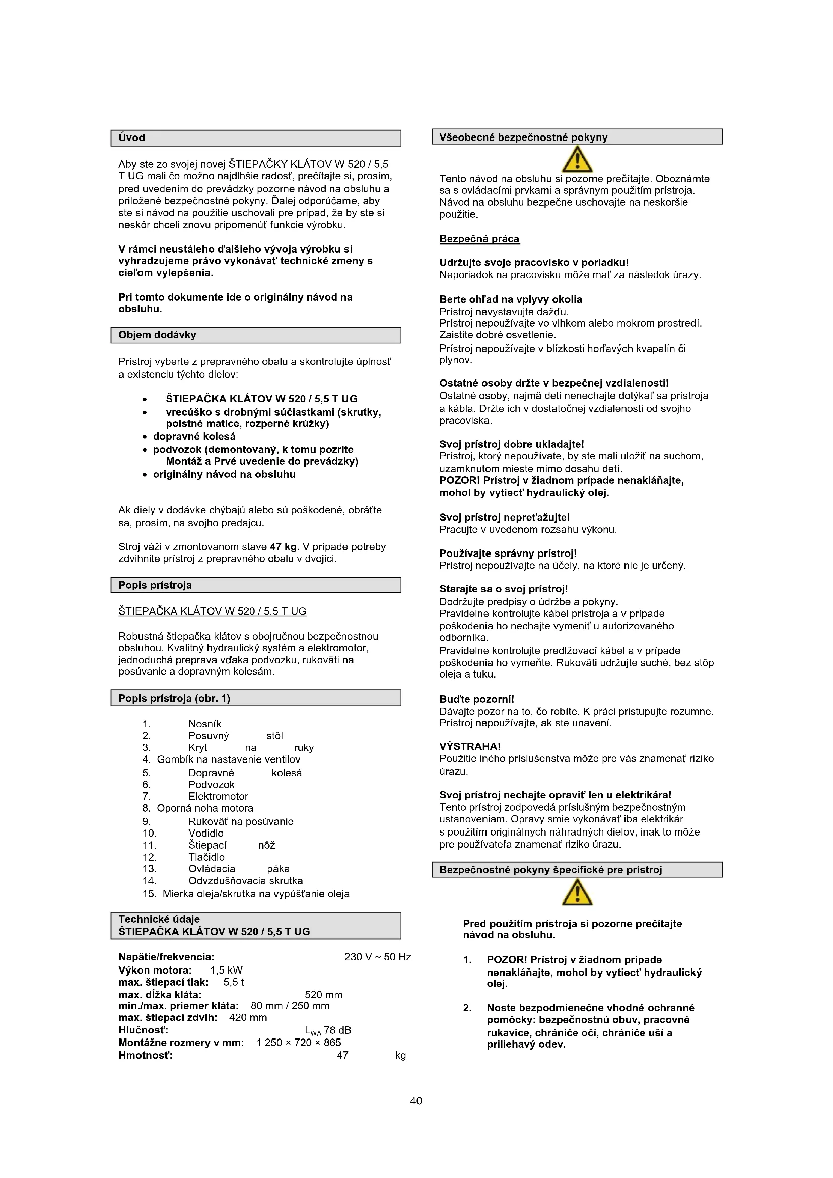 - Pred každým začatim práce je potrebné skontrolová triadnu funkciu stroja a jeho bezpečnostné zariadenia.