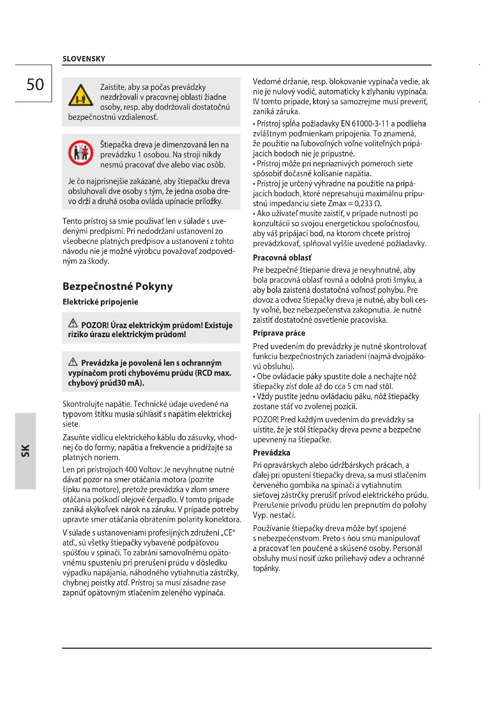 Štiepačka dreva je dimenzovaná len na prevádzku 1 osobou. Na stroji nikdy nesmú pracovať dve alebo viac osôb.