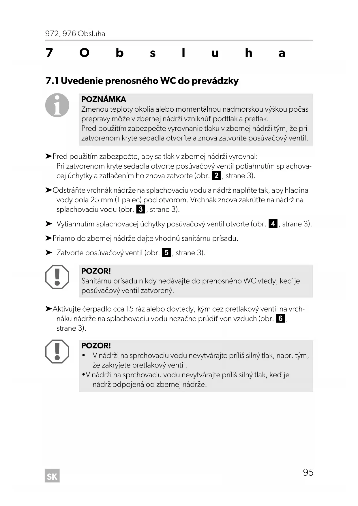 POZNÁMKA Zmenou teploty okolia alebo momentálnou nadmorskou výškou počas prepravy môže v zbernej nádrži vzniknúť podtlak a pretlak. Pred použitím zabezpečte vyrovnanie tlaku v zbernej nádrži tým, že pri zatvorenom kryte sedadla otvoríte a znova zatvoríte posúvačový ventil. POZOR! Sanitárnu prísadu nikdy nedávajte do prenosného WC vtedy, keď je posúvačový ventil zatvorený. POZOR!