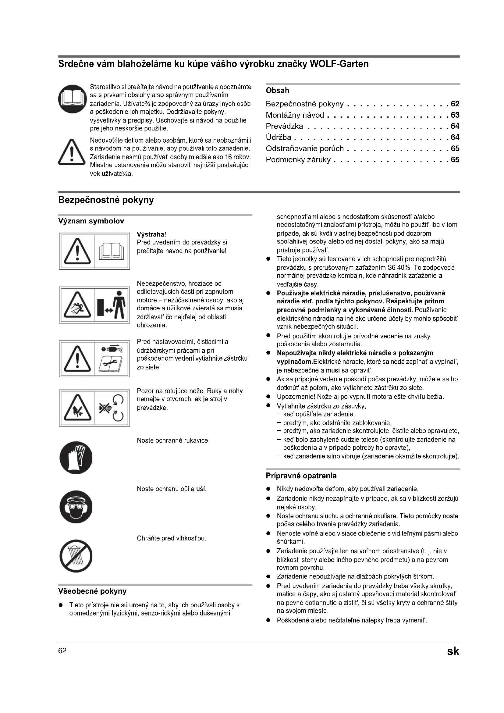 Nebezpečenstvo, hroziace od odlietavajúcich Častí pri zapnutom motore - nezúčastné osoby, ako aj domáce a užitkové zvierátá sa musia zdržiavat' co najdalej od oblasti ohrozenia.