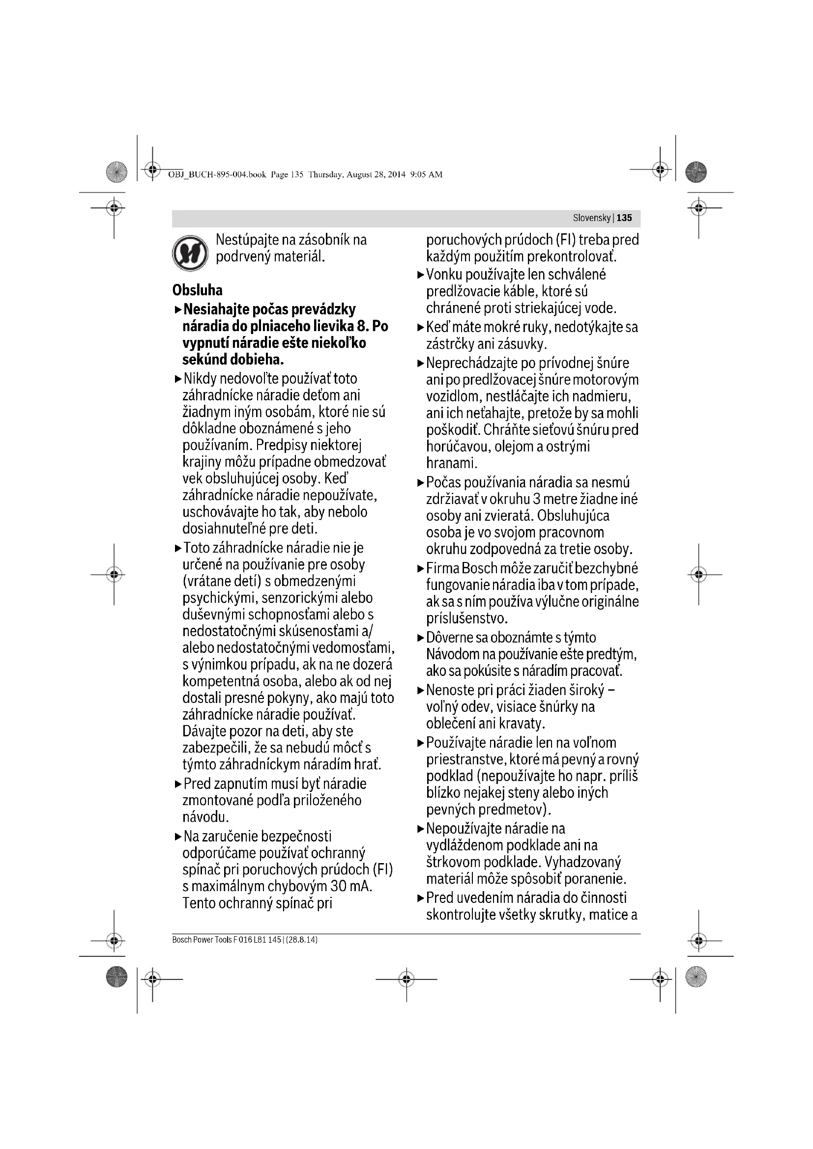 BUĎTE OPATRNÝ: Nevhodné predlžovacie šnúry, ktoré nezodpovedajú predpisom, môžu byť nebezpečné. Predlžovacia šnúra, zástrčka a spojka musia byť na používanie vo vonkajšom prostredí vyrobené vo vodotesnom vyhotovení, ktoré je schválené na používanie vo vonkajšom prostredí. Káblové spojky musia byť suché a nesmú ležať na zemi. Na zaručenie bezpečnosti odporúčame používať ochranný spínač pri poruchových prúdoch (FI) s maximálnym chybovým 30 mA. Tento ochranný spínač pri poruchových prúdoch (FI) treba pred každým použitím prekontrolovať. Keď je prívodná šnúra poškodená, smie sa zveriť do opravy len autorizovanému servisnému stredisku Bosch. Pri použití navíjacích bubnov na elektrickú šnúru musíte šnúru z káblového bubna odmotať. Montáž Vyberte náradie z obalu. (pozri obrázky A–D). Montáž plniaceho lievika (pozri obrázky E–F) Používanie Uvedenie do prevádzky (pozri obrázok G) Náradie postavte vždy len na pevný a vodorovný podklad. Počas práce náradie nenakláňajte (nepreklápajte), ani ním nepohybujte. Po vypnutí motor náradia ešte dobieha! Korene vždy zbavte nalepenej zeme. Cudzie telesá ako kamene, sklo, kov, textilné látky a plasty sa do plniaceho lievika 8 nesmú dostať. V opačnom prípade by sa rezací valec 16 mohol poškodiť. Plniaci lievik 8 musí byť prázdny. Zapnutie Stlačte zelené tlačidlo 4. Vypnutie Stlačte červené tlačidlo „Stop“-tlačidlo 5. Na lepšiu ochranu mechanických prvkov sa záhradnícke náradie nedá 2 sekundy znova spustiť. 3 600 ... H03 0.. H03 1.. H03 2.. H03 3.. Vyhlasujeme na výhradnú zodpovednosť, že výrobok opísaný v časti „Technické údaje“ spĺňa všetky príslušné ustanovenia smerníc 2011/65/EÚ, 2014/30/EÚ, 2006/42/ES, 2000/14/ES vrátane ich zmien a je v súlade s nasledujúcimi normami: EN 60335-1, EN 50434. 2000/14/ES: Garantovaná hladina akustického výkonu: Spôsob hodnotenia konformity podľa prílohy V. dB(A) 92 92 Henk Becker Executive Vice President Engineering Helmut Heinzelmann Head of Product Certification PT/ETM9 Vyklopte kryt rezacieho mechanizmu 13 smerom dozadu. Zaveste plniaci lievik 8 do záhradníckeho náradia a potom uvoľnite kryt rezacieho mechanizmu 13. Stlačte plniaci lievik 8 smerom dole a otočte červený aretačný gombík 9 až na doraz v smere pohybu hodinových ručičiek, aby ste plniaci lievik 8 zaaretovali; na tento účel je potrebné uskutočniť cca 5 plných obrátok aretačného gombíka 9. OBJ_BUCH-895-004.book Page 139 Thursday, August 28, 2014 9:05 AM140 | Slovensky F 016 L81 145 | (28.8.14) Bosch Power Tools Ochrana proti opätovnému rozbehnutiu Keď vypadne elektrická sieť, náradie vypnite. Pri opätovnej aktivácii elektrickej siete by sa mohlo náradie samočinne znova zapnúť. Spätný chod Keď chcete zmeniť smer obrátok, stlačte a podržte v stlačenej polohe žlté tlačidlo 6. Rezací valec 16 beží opačným smerom a uvoľní takto materiál, ktorý ho blokoval. Ochrana proti preťaženiu Príliš vysoké zaťaženie (napr. zablokovanie nožového valca