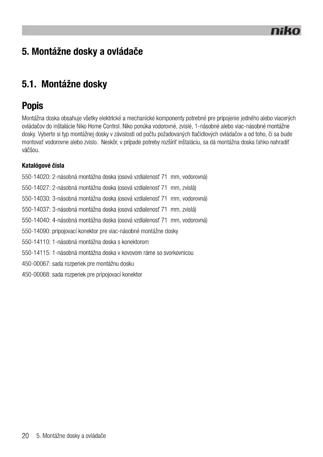 Montážna doska obsahuje vsetky elektrické a mechanické componenty potrebné pre priopojenie jegného alebo viacerych ovládačov do instalácie Niko Home Control. Niko ponúka vodorovné, zvislé, 1-násobné alebo viac-násobné montážne dosky. Vyberte si typ montážnej dosky v závislosti od poctu požadovaných tlacdidlových ovládačov a od toho, cis sa bude montovat vodorovné alebo zvislo. Neskór, v priade potreby rozsírit instaláciu, sa d montážna doska lahko nahraditvacšou.