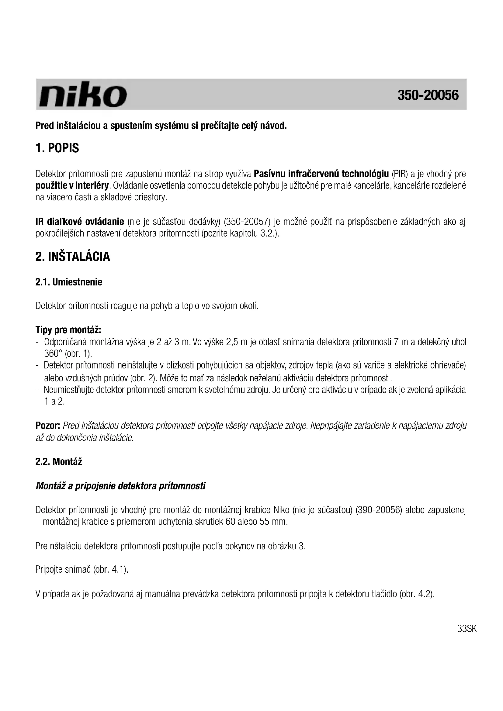 - Tento námod musí byt odovzdany uživateřovi. Musí byt sučastou dokumentácie o elektrickej instaláci a musí byt odovzdany kaźdemu novému uživateřovi. Dalsie kópie námodu su dostupné na web stranke Niko alebo cze sluzby zákaznikom. Najnoví námod na instaláciu tohto vyrobku je k dispozicii na internetovych strankach Niko.