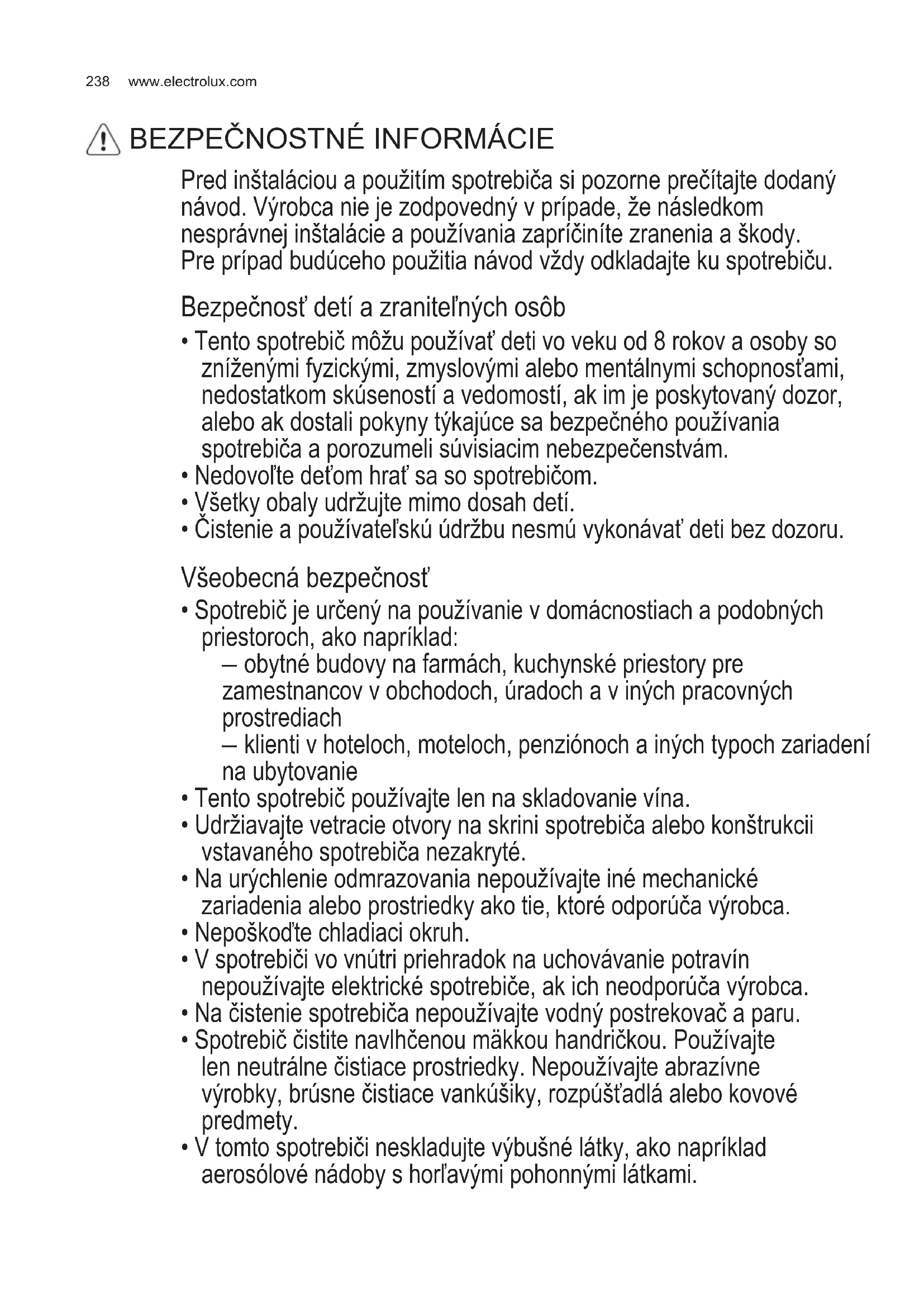 STAROSTLIVOSŤOŽIVOTNÉPROSTREDIE.................................................254238 www.electrolux.com Pred inštaláciou a použitím spotrebiča si pozorne prečítajte dodaný návod. Výrobca nie je zodpovedný v prípade, že následkom nesprávnej inštalácie a používania zapríčiníte zranenia a škody. Pre prípad budúceho použitia návod vždy odkladajte ku spotrebiču. Bezpečnosť detí a zraniteľných osôb