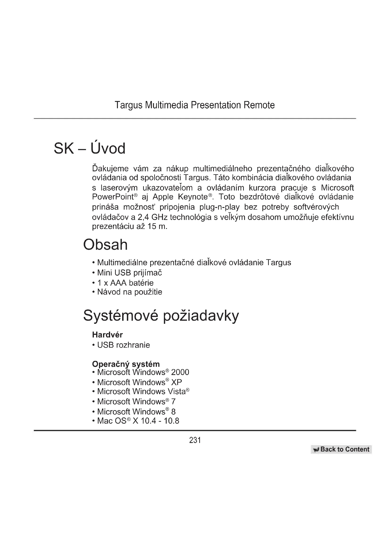 X 10.4 - 10.8 SK – Úvod Ďakujeme vám za nákup multimediálneho prezentačného diaľkového ovládania od spoločnosti Targus. Táto kombinácia diaľkového ovládania s laserovým ukazovateľom a ovládaním kurzora pracuje s Microsoft PowerPoint