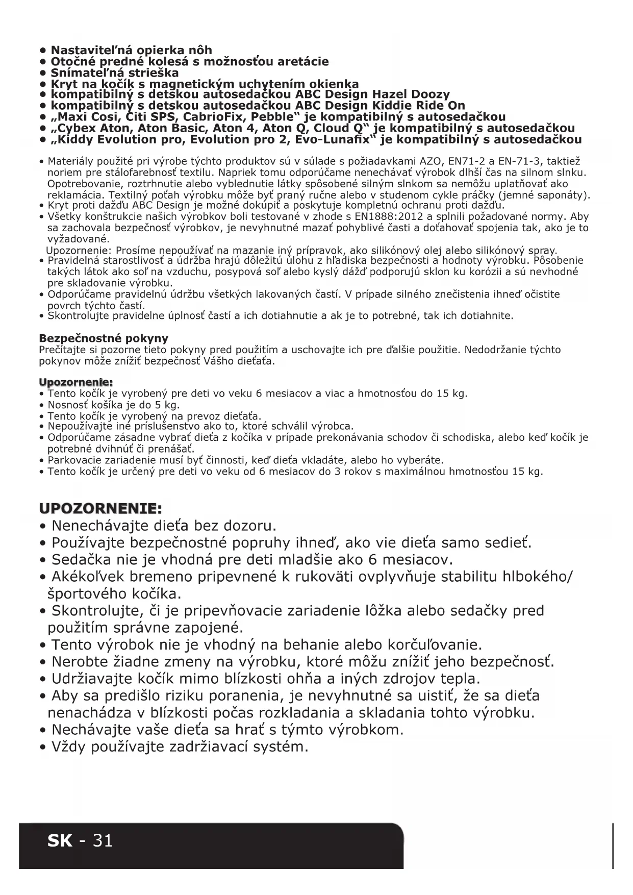 - Skontrolujte pravidelne úplnosť častí a ich dotiahnutie a ak je to potrebné, tak ich dotiahnite. Bezpečnostné pokyny Prečítajte si pozorne tieto pokyny pred použitím a uschovajte ich pre ďalšie použitie. Nedodržanie týchto pokynov môže znížiť bezpečnosť Vášho dieťaťa. Upozornenie: