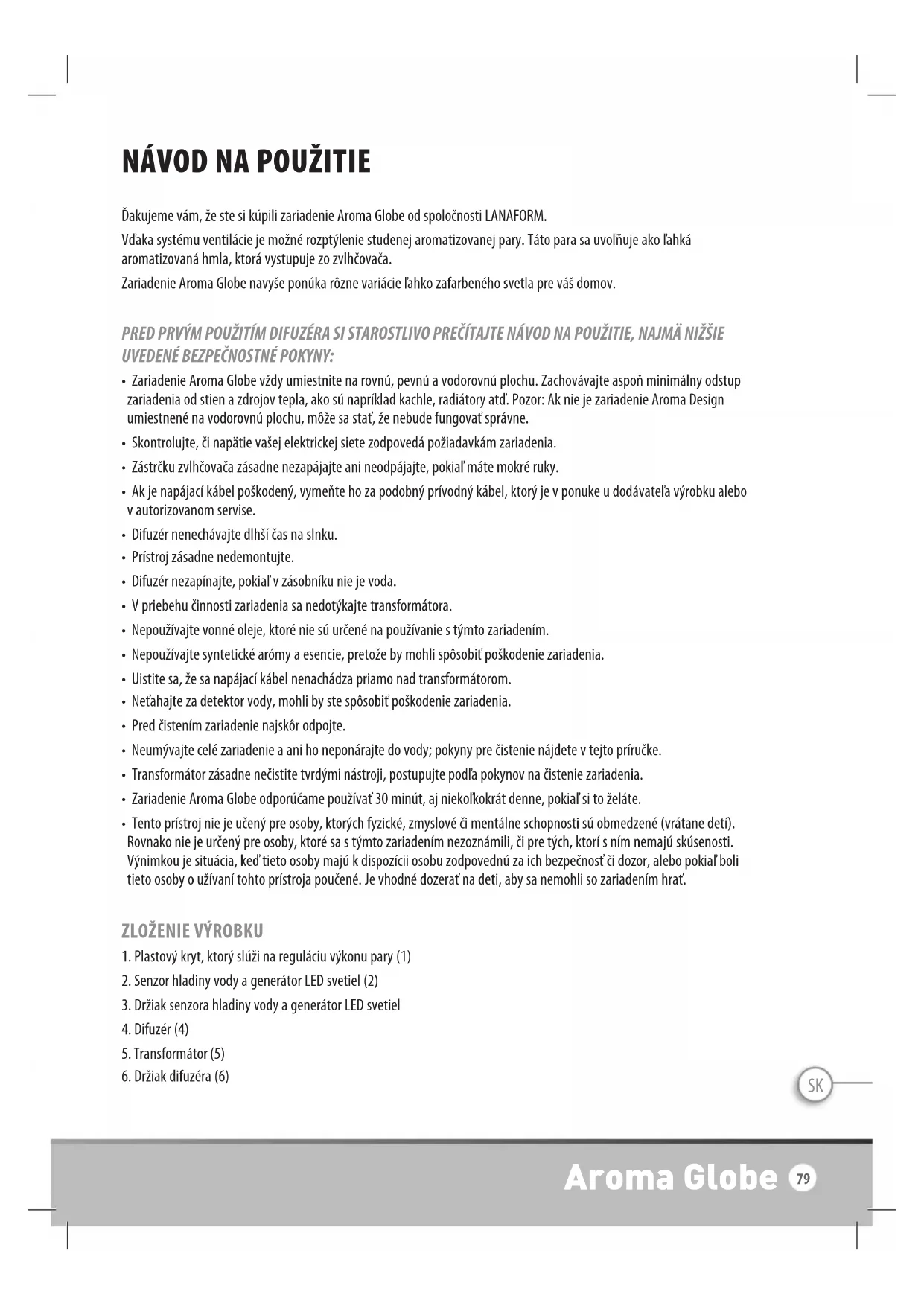 Ďakujeme vám, že ste si kúpili zariadenie Aroma Globe od spoločnosti LANAFORM. Vďaka systému ventilácie je možné rozptýlenie studenej aromatizovanej pary. Táto para sa uvoľňuje ako ľahká aromatizovaná hmla, ktorá vystupuje zo zvlhčovača. Zariadenie Aroma Globe navyše ponúka rôzne variácie ľahko zafarbeného svetla pre váš domov. PRED PRVÝM POUŽITÍM DIFUZÉRA SI STAROSTLIVO PREČÍTAJTE NÁVOD NA POUŽITIE, NAJMÄ NIŽŠIE UVEDENÉ BEZPEČNOSTNÉ POKYNY: