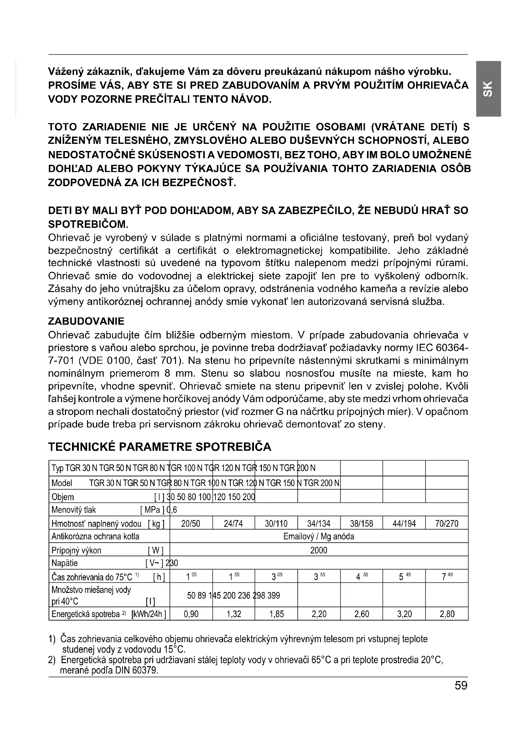 Vážený zákazník, ďakujeme Vám za dôveru preukázanú nákupom nášho výrobku. PROSÍME VÁS, ABY STE SI PRED ZABUDOVANÍM A PRVÝM POUŽITÍM OHRIEVAČA VODY POZORNE PREČÍTALI TENTO NÁVOD. TOTO ZARIADENIE NIE JE URČENÝ NA POUŽITIE OSOBAMI (VRÁTANE DETÍ) S ZNÍŽENÝM TELESNÉHO, ZMYSLOVÉHO ALEBO DUŠEVNÝCH SCHOPNOSTÍ, ALEBO NEDOSTATOČNÉ SKÚSENOSTI A VEDOMOSTI, BEZ TOHO, ABY IM BOLO UMOŽNENÉ DOHĽAD ALEBO POKYNY TÝKAJÚCE SA POUŽÍVANIA TOHTO ZARIADENIA OSÔB ZODPOVEDNÁ ZA ICH BEZPEČNOSŤ. DETI BY MALI BYŤ POD DOHĽADOM, ABY SA ZABEZPEČILO, ŽE NEBUDÚ HRAŤ SO SPOTREBIČOM. Ohrievač je vyrobený v súlade s platnými normami a ofi ciálne testovaný, preň bol vydaný bezpečnostný certifi kát a certifi kát o elektromagnetickej kompatibilite. Jeho základné technické vlastnosti sú uvedené na typovom štítku nalepenom medzi prípojnými rúrami. Ohrievač smie do vodovodnej a elektrickej siete zapojiť len pre to vyškolený odborník. Zásahy do jeho vnútrajšku za účelom opravy, odstránenia vodného kameňa a revízie alebo výmeny antikoróznej ochrannej anódy smie vykonať len autorizovaná servisná služba. ZABUDOVANIE Ohrievač zabudujte čím bližšie odberným miestom. V prípade zabudovania ohrievača v priestore s vaňou alebo sprchou, je povinne treba dodržiavať požiadavky normy IEC 60364- 7-701 (VDE 0100, časť 701). Na stenu ho pripevníte nástennými skrutkami s minimálnym nominálnym priemerom 8 mm. Stenu so slabou nosnosťou musíte na mieste, kam ho pripevníte, vhodne spevniť. Ohrievač smiete na stenu pripevniť len v zvislej polohe. Kvôli ľahšej kontrole a výmene horčíkovej anódy Vám odporúčame, aby ste medzi vrhom ohrievača a stropom nechali dostatočný priestor (vi ď rozmer G na náčrtku prípojných mier). V opačnom prípade bude treba pri servisnom zákroku ohrievač demontovať zo steny.