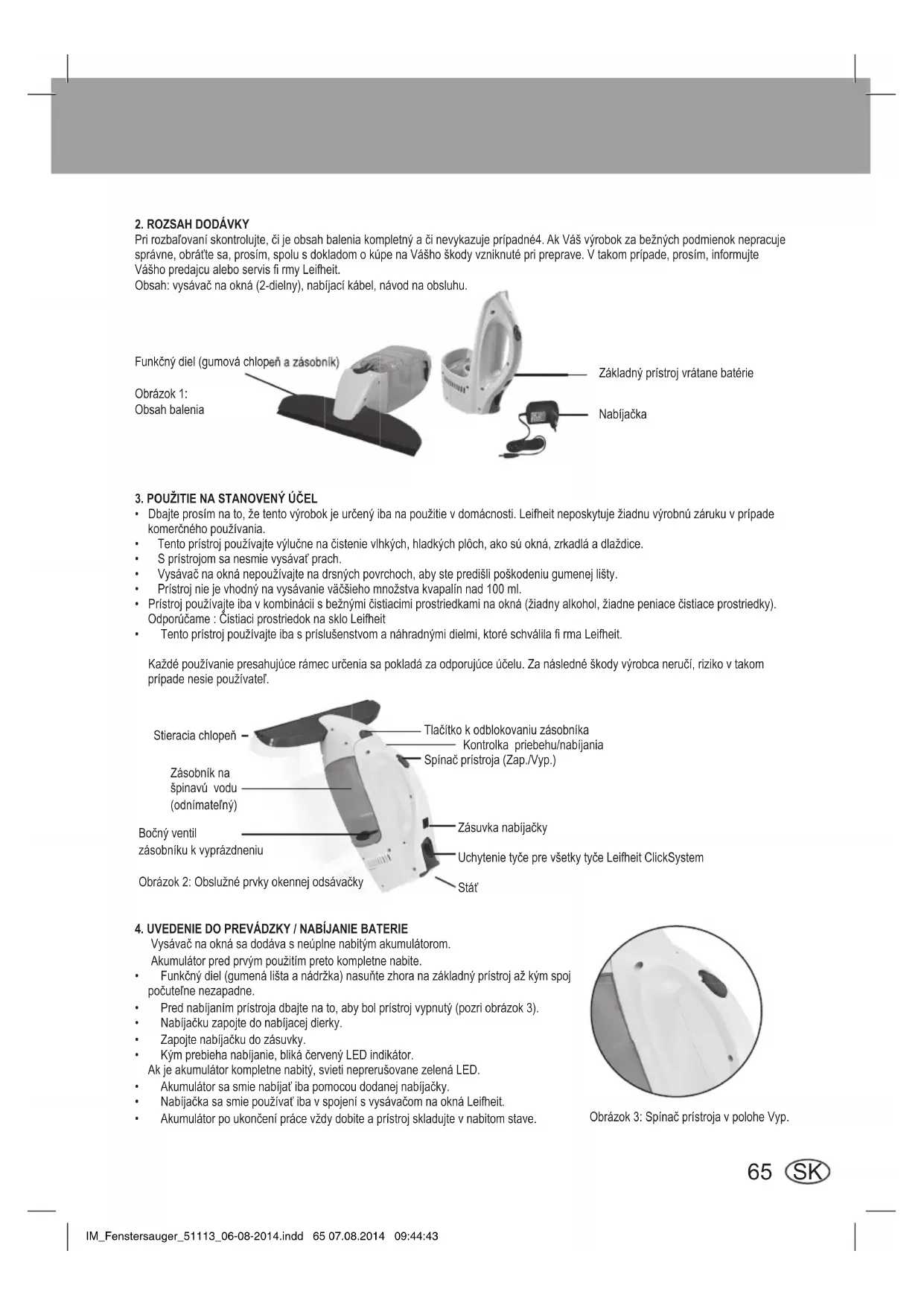 - Akumulátorpoukončeníprácevždydobiteaprístrojskladujtevnabitomstave. Obrázok3:SpínačprístrojavpoloheVyp. Stáť 2.ROZSAHDODÁVKY Prirozbaľovanískontrolujte,čijeobsahbaleniakompletnýačinevykazujeprípadné4.AkVášvýrobokzabežnýchpodmienoknepracuje správne,obráťtesa,prosím,spolusdokladomokúpenaVášhoškodyvzniknutépripreprave.Vtakomprípade,prosím,informujte VášhopredajcualeboservisrmyLeifheit. Obsah:vysávačnaokná(2-dielny),nabíjacíkábel,návodnaobsluhu. IM_Fenstersauger_51113_06-08-2014.indd 65 07.08.2014 09:44:4366 Obrázok4: Vyprázdnenie zásobníka Obrázok5: Čisteniezasobníka 5.POUŽITIE 1.Vysávaniepovrchu