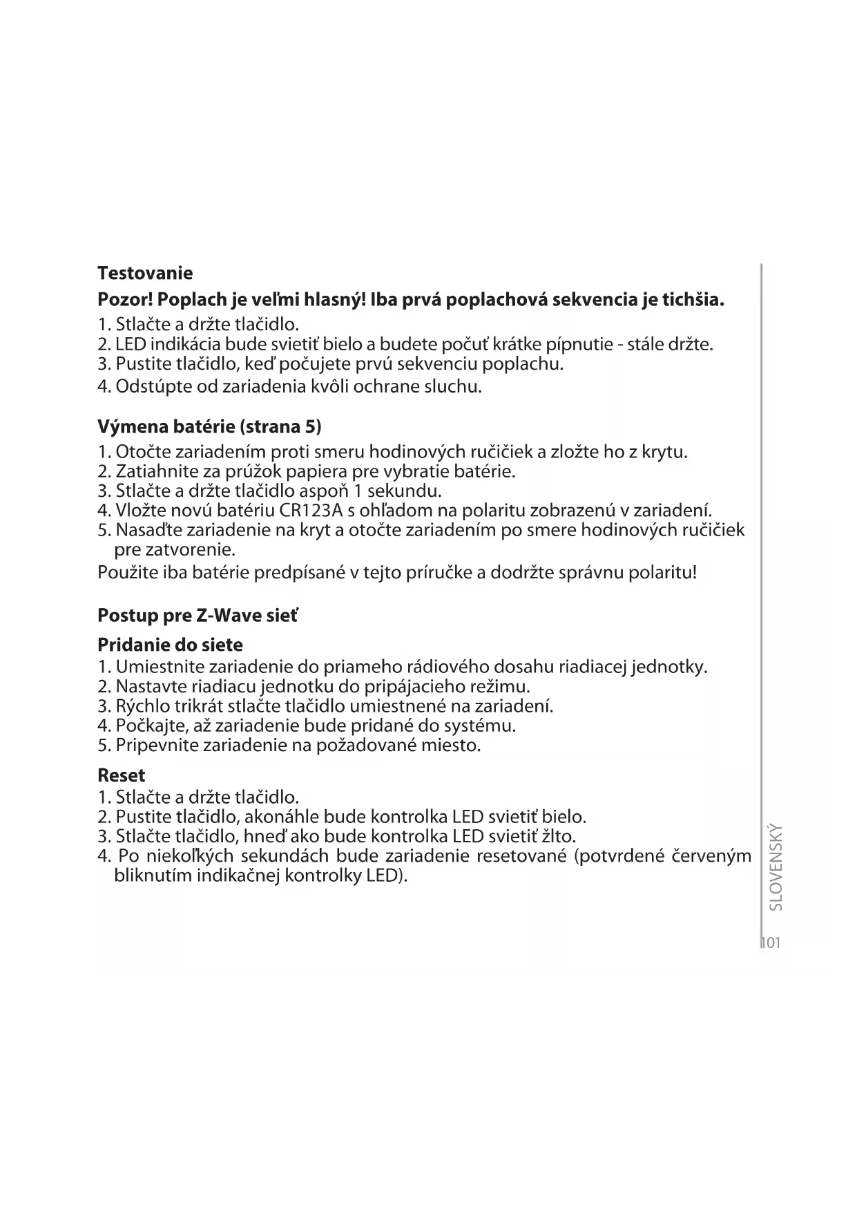 1 x PÍPNUTIE 1 x PURPUROVÉ BLIKNUTIE Bez signálu Skontrolujte dostupnosť Z-Wave — BLIKÁ AZÚROVÁ Aktualizácia rmware Počkajte na dokončenie SLOVENSKÝ101 Testovanie Pozor! Poplach je veľmi hlasný! Iba prvá poplachová sekvencia je tichšia.