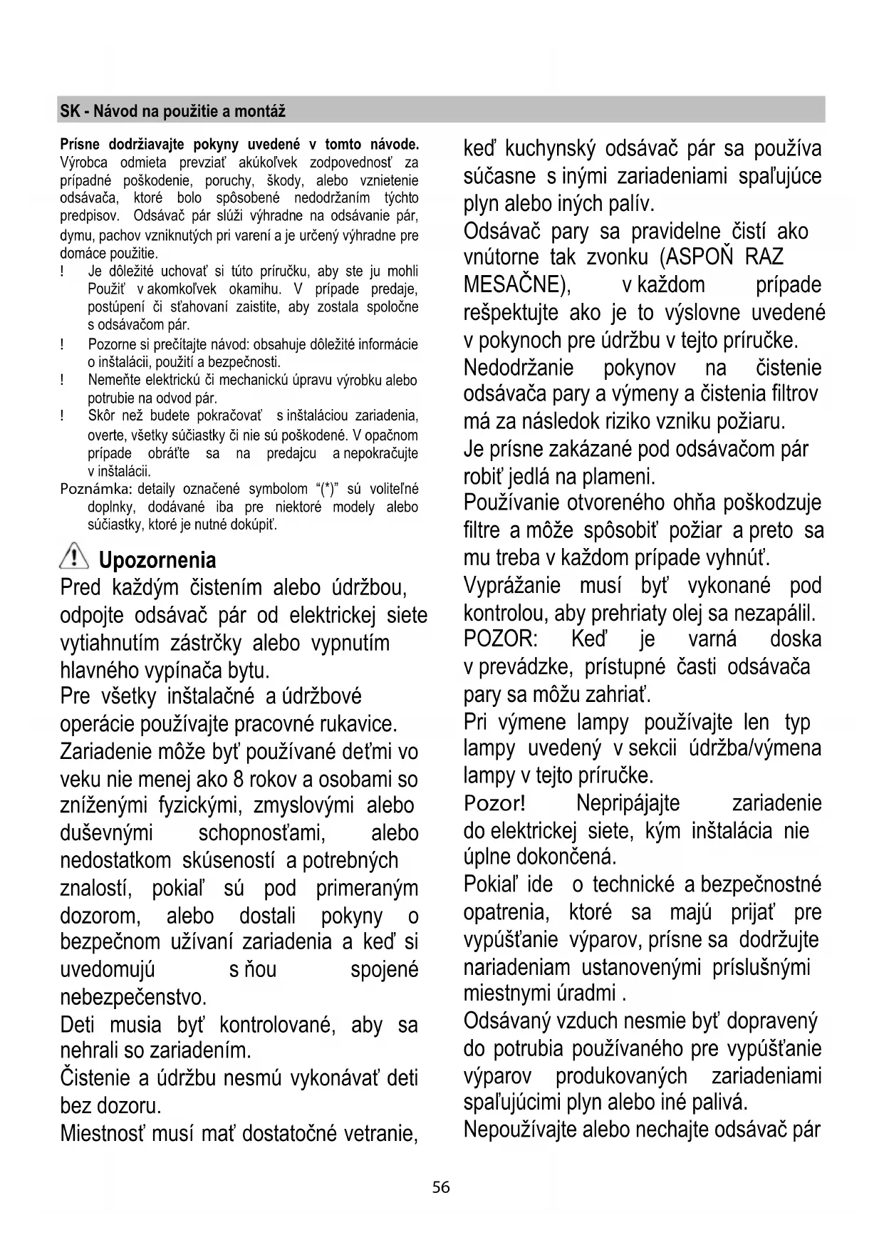 Provoz Odsavač je vybaven ovládacím panelem s ovládáním rychlosti odsávání a zapínáním osvětlení pracovní plochy. V případě velmi intenzivní koncentrace kuchyňských par použijte maximální sací výkon. Doporučuje se zapnout digestoř 5 minut před zahájením vaření a vypnout ji cca 15 minut po ukončení vaření. Údržba Čištění Pro čištění je třeba použít VÝHRADNĚ látku navlhčenou neutrálními tekutými čistícími prostředky. NEPOUŽÍVEJTE ŽÁDNÉ NÁSTROJE NEBO POMŮCKY NA ČIŠTĚNÍ. NEPOUŽÍVEJTE ALKOHOL! Tukový filtr Zadržuje částice tuku uvolňující se při vaření. Tukový filtr se musí 1 x do měsíce vyčistit . Je možné jej čistit ručně jemným mycím prostředkem nebo v kuchyňské myčce při nejnižší teplotě a kratším programu. Demontáž tukového filtru je znázorněna - zatlačte na západku filtru. Obr. 1 Filtr s aktivním uhlíkem (jen u filtrační verze) Obr. 2 Tento filtr pohlcuje nepříjemné pachy vznikající při vaření. Saturace filtru s uhlíkem nastane po více či méně dlouhém užití, tj. závisí na typu kuchyně a pravidelném čištění filtru proti mastnotám. V každém případě je nutné nahradit patronu maximálně jednou za 4 měsíce. NEMŮŽE být umýván či regenerován. Vyjměte filtry proti mastnotám. Namon tujte filtry kryjící motor. Ověřte si zda čepy R na dopravníku se kryjí s očnicem i S , pak otáčejte ve směru hodinových ručiček až do zarážky anebo K demontáži postupujte opačným způsobem. Nasaďte opět filtry proti mastnotám. Výměna žárovek Obr. 1 Odpojte přístroj z elektrické sítě. Pozor! Dříve než se doktnete svítidel si ověřte že vychladla. Poškozenou žárovku vyměňte za novou stejného typu, dle údajů uvedených na technickém štítku nebo vedle žárovky přímo na digestoři. K přístupu do úložného prostoru svítidel vyjměte kryt A. Jestliže osvětlení nefunguje, dříve než zavoláte servis si ověřte, zda jste správně nasadili žárovky do uložení.56 SK - Návod na použitie a montáž Prísne dodržiavajte pokyny uvedené v tomto návode. Výrobca odmieta prevziať akúkoľvek zodpovednosť za prípadné poškodenie, poruchy, škody, alebo vznietenie odsávača, ktoré bolo spôsobené nedodržaním týchto predpisov. Odsávač pár slúži výhradne na odsávanie pár, dymu, pachov vzniknutých pri varení a je určený výhradne pre domáce použitie. ! Je dôležité uchovať si túto príručku, aby ste ju mohli Použiť v akomkoľvek okamihu. V prípade predaje, postúpení či sťahovaní zaistite, aby zostala spoločne s odsávačom pár. ! Pozorne si prečítajte návod: obsahuje dôležité informácie o inštalácii, použití a bezpečnosti. ! Nemeňte elektrickú či mechanickú úpravu výrobku alebo potrubie na odvod pár. ! Skôr než budete pokračovať s inštaláciou zariadenia, overte, všetky súčiastky či nie sú poškodené. V opačnom prípade obráťte sa na predajcu a nepokračujte v inštalácii. Poznámka: detaily označené symbolom “(*)” sú voliteľné doplnky, dodávané iba pre niektoré modely alebo súčiastky, ktoré je nutné dokúpiť. Upozornenia Pred každým čistením alebo údržbou, odpojte odsávač pár od elektrickej siete vytiahnutím zástrčky alebo vypnutím hlavného vypínača bytu. Pre všetky inštalačné a údržbové operácie používajte pracovné rukavice. Zariadenie môže byť používané deťmi vo veku nie menej ako 8 rokov a osobami so zníženými fyzickými, zmyslovými alebo duševnými schopnosťami, alebo nedostatkom skúseností a potrebných znalostí, pokiaľ sú pod primeraným dozorom, alebo dostali pokyny o bezpečnom užívaní zariadenia a keď si uvedomujú s ňou spojené nebezpečenstvo. Deti musia byť kontrolované, aby sa nehrali so zariadením. Čistenie a údržbu nesmú vykonávať deti bez dozoru. Miestnosť musí mať dostatočné vetranie, keď kuchynský odsávač pár sa používa súčasne s inými zariadeniami spaľujúce plyn alebo iných palív. Odsávač pary sa pravidelne čistí ako vnútorne tak zvonku (ASPOŇ RAZ MESAČNE), v každom prípade rešpektujte ako je to výslovne uvedené v pokynoch pre údržbu v tejto príručke. Nedodržanie pokynov na čistenie odsávača pary a výmeny a čistenia filtrov má za následok riziko vzniku požiaru. Je prísne zakázané pod odsávačom pár robiť jedlá na plameni. Používanie otvoreného ohňa poškodzuje filtre a môže spôsobiť požiar a preto sa mu treba v každom prípade vyhnúť. Vyprážanie musí byť vykonané pod kontrolou, aby prehriaty olej sa nezapálil. POZOR: Keď je varná doska v prevádzke, prístupné časti odsávača pary sa môžu zahriať. Pri výmene lampy používajte len typ lampy uvedený v sekcii údržba/výmena lampy v tejto príručke. Pozor! Nepripájajte zariadenie do elektrickej siete, kým inštalácia nie úplne dokončená. Pokiaľ ide o technické a bezpečnostné opatrenia, ktoré sa majú prijať pre vypúšťanie výparov, prísne sa dodržujte nariadeniam ustanovenými príslušnými miestnymi úradmi . Odsávaný vzduch nesmie byť dopravený do potrubia používaného pre vypúšťanie výparov produkovaných zariadeniami spaľujúcimi plyn alebo iné palivá. Nepoužívajte alebo nechajte odsávač pár57 bez správne namontovaných lámp kvôli možnému riziku úrazu elektrickým prúdom. Nikdy nepoužívajte odsávač pár bez správne namontovanej mriežky! Odsávač pár sa nesmie NIKDY používať ako nosný povrch, pokiaľ nie je výslovne uvedené Používajte len upevňovacie skrutky dodávané s výrobkom pre inštaláciu alebo, ak nie sú súčasťou dodávky, kúpte správny typ skrutiek. Používajte správnu dĺžku skrutiek, ktorá je označená v Návode na inštaláciu. Ak si nie ste istí, poraďte sa s autorizovaným servisným strediskom alebo podobným kvalifikovaným