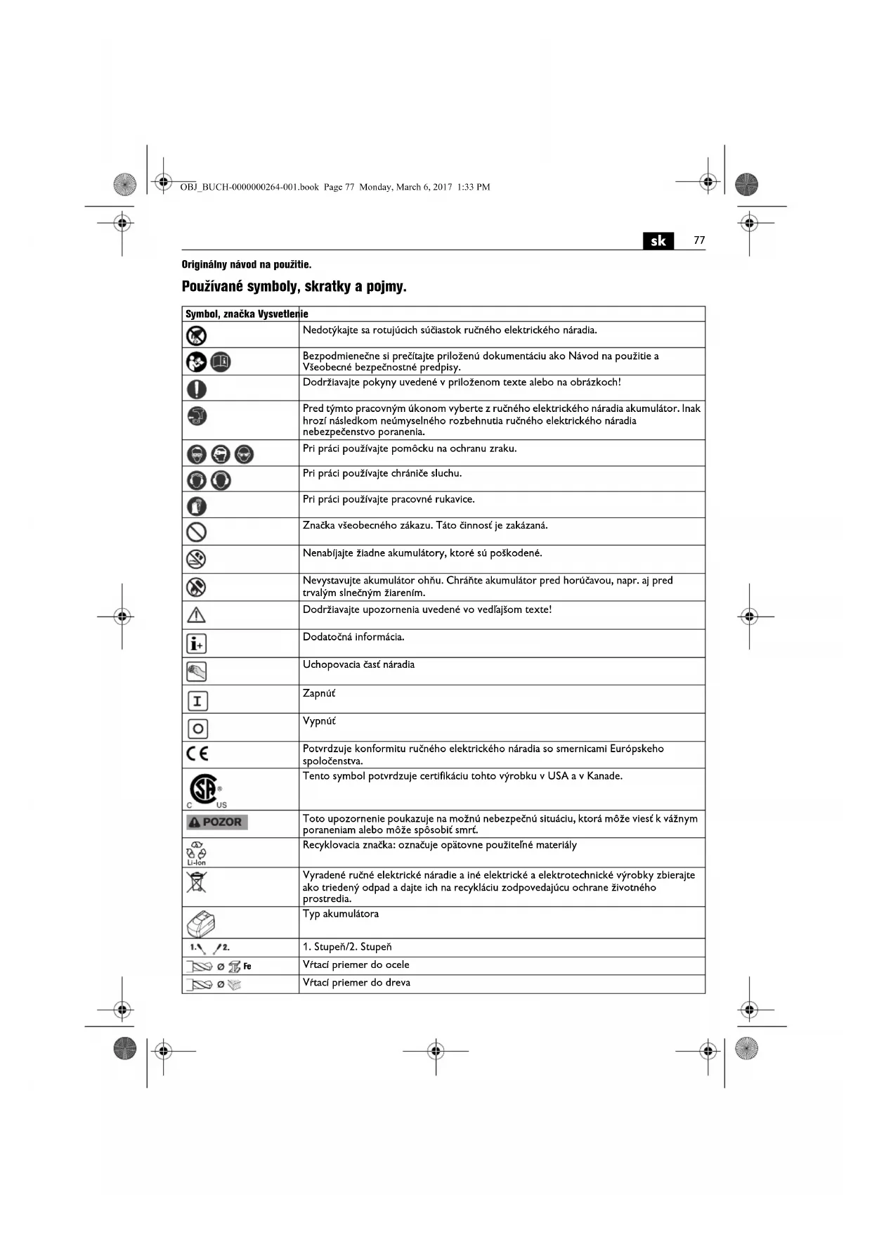 | Vyradené ručné elektrické náradie a iné elektrické a elektrotechnické výrobky zbierajte ako triedený odpad a dajte ich na recykláciu zodpovedajúcu ochrane životného prostredia. | |