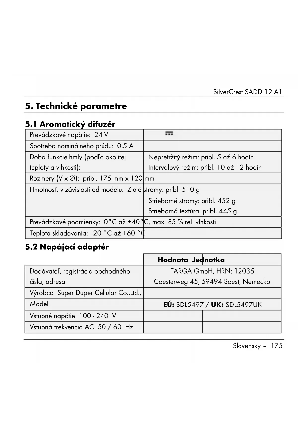 Produkt spĺňa požiadavky príslušných európskych a národných smerníc. Poskytujeme dôkaz súladu. Výrobca má príslušné vyhlásenia a dokumentáciu. Externý napájací adaptér je v súlade s nariadením 2019/1782/EÚ. Produkt spĺňa požiadavky príslušných národných smerníc Veľkej Británie. Úplné Vyhlásenie o zhode EÚ je k dispozícii na prevzatie cez tento odkaz: https://www.targa.gmbh/downloads/conformity/365072_2101.pdfSilverCrest SADD 12 A1 Slovensky – 195