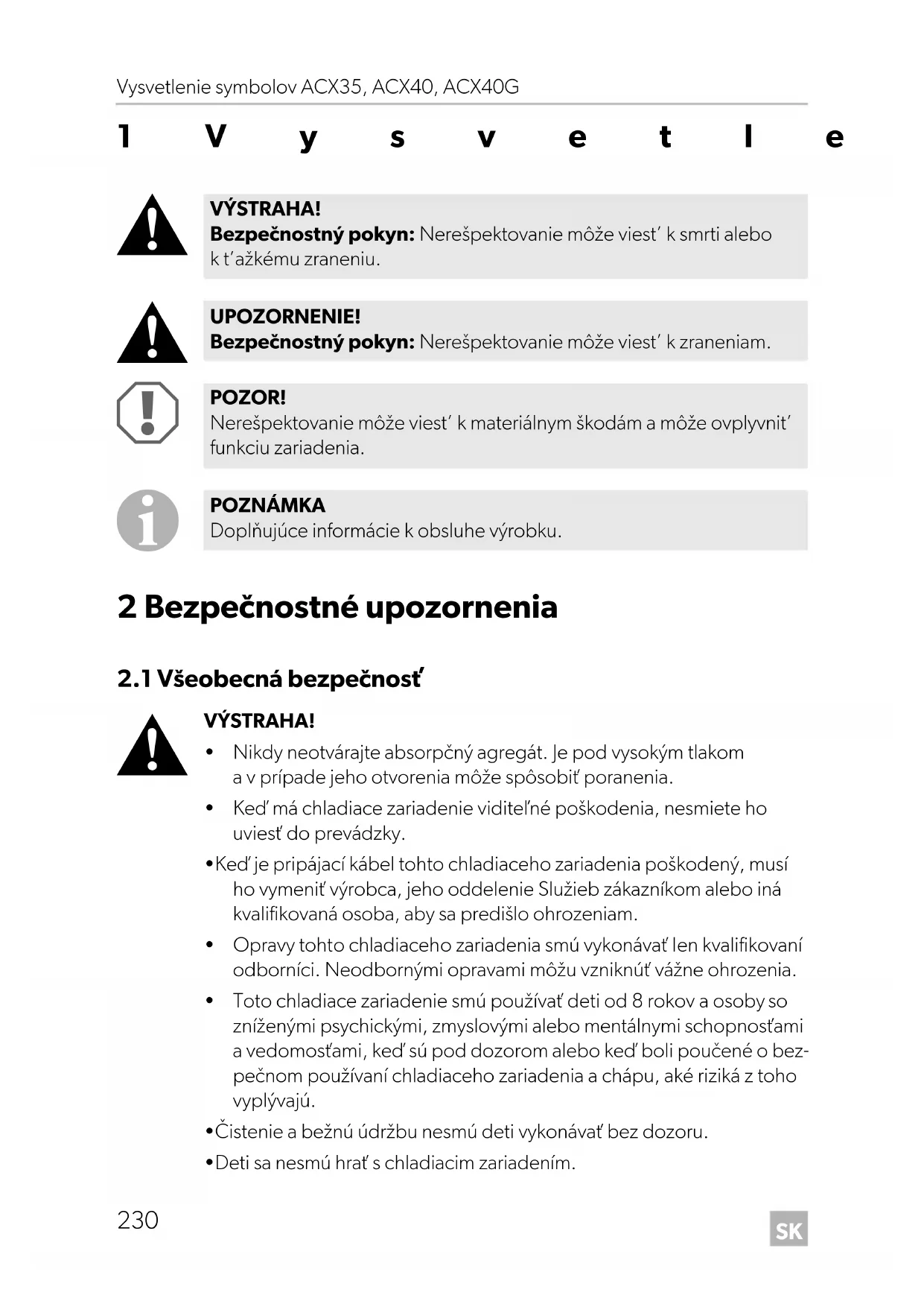 - Deti sa nesmú hrať s chladiacim zariadením. VÝSTRAHA! Bezpečnostný pokyn: Nerešpektovanie môže viest’ k smrti alebo k t’ažkému zraneniu. UPOZORNENIE! Bezpečnostný pokyn: Nerešpektovanie môže viest’ k zraneniam. POZOR! Nerešpektovanie môže viest’ k materiálnym škodám a môže ovplyvnit’ funkciu zariadenia. POZNÁMKA Doplňujúce informácie k obsluhe výrobku. ACX35-ACX40-ACX40G-O-15s.book Seite 230 Freitag, 22. September 2017 6:24 18SK ACX35, ACX40, ACX40G Bezpečnostné upozornenia