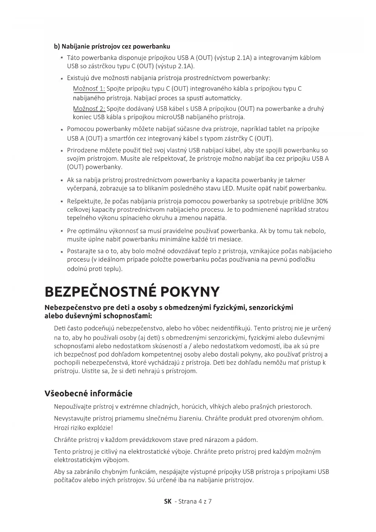 Dečastopodceňujúnebezpečenstvo,alebohovôbecneidenkujú.Tentoprístrojniejeurčený nato,abyhopoužívaliosoby(ajde)sobmedzenýmisenzorickými,fyzickýmialeboduševnými schopnosťamialebonedostatkomskúsenosa/alebonedostatkomvedomos,ibaaksúpre ichbezpečnosťpoddohľadomkompetentnejosobyalebodostalipokyny,akopoužívaťprístroja pochopilinebezpečenstvá,ktorévychádzajúzprístroja.Debezdohľadunemôžumaťprístupk prístroju.Uistesa,žesidenehrajúsprístrojom. Nebezpečenstvo pre deti a osoby s obmedzenými fyzickými, senzorickými alebo duševnými schopnosťami: b) Nabíjanie prístrojov cez powerbanku TátopowerbankadisponujeprípojkouUSBA(OUT)(výstup2.1A)aintegrovanýmkáblom USBsozástrčkoutypuC(OUT)(výstup2.1A). Existujúdvemožnosnabíjaniaprístrojaprostredníctvompowerbanky: Možnosť1:SpojteprípojkutypuC(OUT)integrovanéhokáblasprípojkoutypuC nabíjanéhoprístroja.Nabíjacíprocessaspusautomacky. Možnosť2:SpojtedodávanýUSBkábelsUSBAprípojkou(OUT)napowerbankeadruhý koniecUSBkáblasprípojkoumicroUSBnabíjanéhoprístroja. Pomocoupowerbankymôžetenabíjaťsúčasnedvaprístroje,napríkladtabletnaprípojke USBA(OUT)asmaróncezintegrovanýkábelstypomzástrčkyC(OUT). PrirodzenemôžetepoužiťežsvojvlastnýUSBnabíjacíkábel,abystespojilipowerbankuso svojímprístrojom.Musítealerešpektovať,žeprístrojemožnonabíjaťibacezprípojkuUSBA (OUT)powerbanky. Aksanabíjaprístrojprostredníctvompowerbankyakapacitapowerbankyjetakmer vyčerpaná,zobrazujesatoblikanímposlednéhostavuLED.Musíteopäťnabiťpowerbanku. Rešpektujte,žepočasnabíjaniaprístrojapomocoupowerbankysaspotrebujepribližne30% celkovejkapacityprostredníctvomnabíjaciehoprocesu.Jetopodmienenénapríkladstratou tepelnéhovýkonuspínaciehookruhuazmenounapäa. Preopmálnuvýkonnosťsamusípravidelnepoužívaťpowerbanka.Akbytomutaknebolo, musíteúplnenabiťpowerbankuminimálnekaždétrimesiace. Postarajtesaoto,abybolomožnéodovzdávaťteplozprístroja,vznikajúcepočasnabíjacieho procesu(videálnomprípadepoložtepowerbankupočaspoužívanianapevnúpodložku odolnúproteplu). Nepoužívajteprístrojvextrémnechladných,horúcich,vlhkýchaleboprašnýchpriestoroch. Nevystavujteprístrojpriamemuslnečnémužiareniu.Chráňteproduktpredotvorenýmohňom. Hrozírizikoexplózie! Chráňteprístrojvkaždomprevádzkovomstaveprednárazomapádom. Tentoprístrojjecitlivýnaelektrostackévýboje.Chráňtepretoprístrojpredkaždýmmožným elektrostackýmvýbojom. Abysazabránilochybnýmfunkciám,nespájajtevýstupnéprípojkyUSBprístrojasprípojkamiUSB počítačovaleboinýchprístrojov.Súurčenéibananabíjanieprístrojov. Všeobecné informácieSK -Strana5z7 Nerozoberajteprístrojnasamostatnésúčiastkyanepokúšajtesahosamiopravovať.Neobsahuje dielynaúdržbuavtomtoprípadezanikázáruka. Nezasúvajtepredmety,ktoréniesúnaplánovanénapoužie,dootvorovvýrobku.Mohlobyto viesťkelektrickémuskratuanímspôsobenémupožiaru. Neobsluhujteprístrojmokrýmirukami. Načistenieprístrojanepoužívajtevodualebochemickéroztoky.Použitenačisteniesuchú handričku. Nepokúšajtesasamiopravovaťprístroj.Zárukazanikávtomtoprípade: Prístrojvytvárapripoužívaníteplo,jetoprirodzené.Produktnemožnopočaspoužívaniazakrývať. Nepoužívajteprístroj,akvykazujeviditeľnéškody,alebojevlhký. TECHNICKÉ ÚDAJE