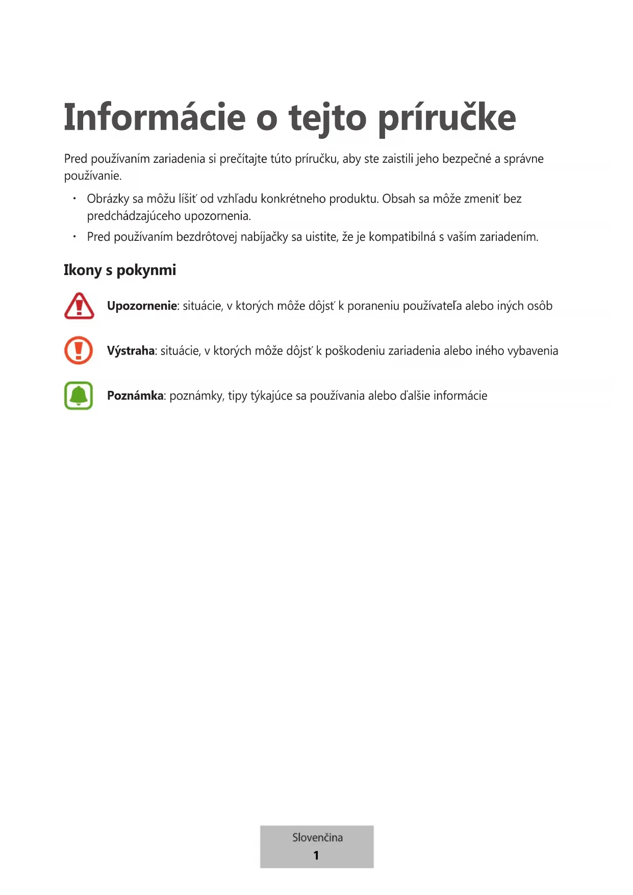 Pred používaním bezdrôtovej nabíjačky sa uistite, že je kompatibilná s vaším zariadením. Ikony s pokynmi Upozornenie: situácie, v ktorých môže dôjsť k poraneniu používateľa alebo iných osôb Výstraha: situácie, v ktorých môže dôjsť k poškodeniu zariadenia alebo iného vybavenia Poznámka: poznámky, tipy týkajúce sa používania alebo ďalšie informácie Slovenčina