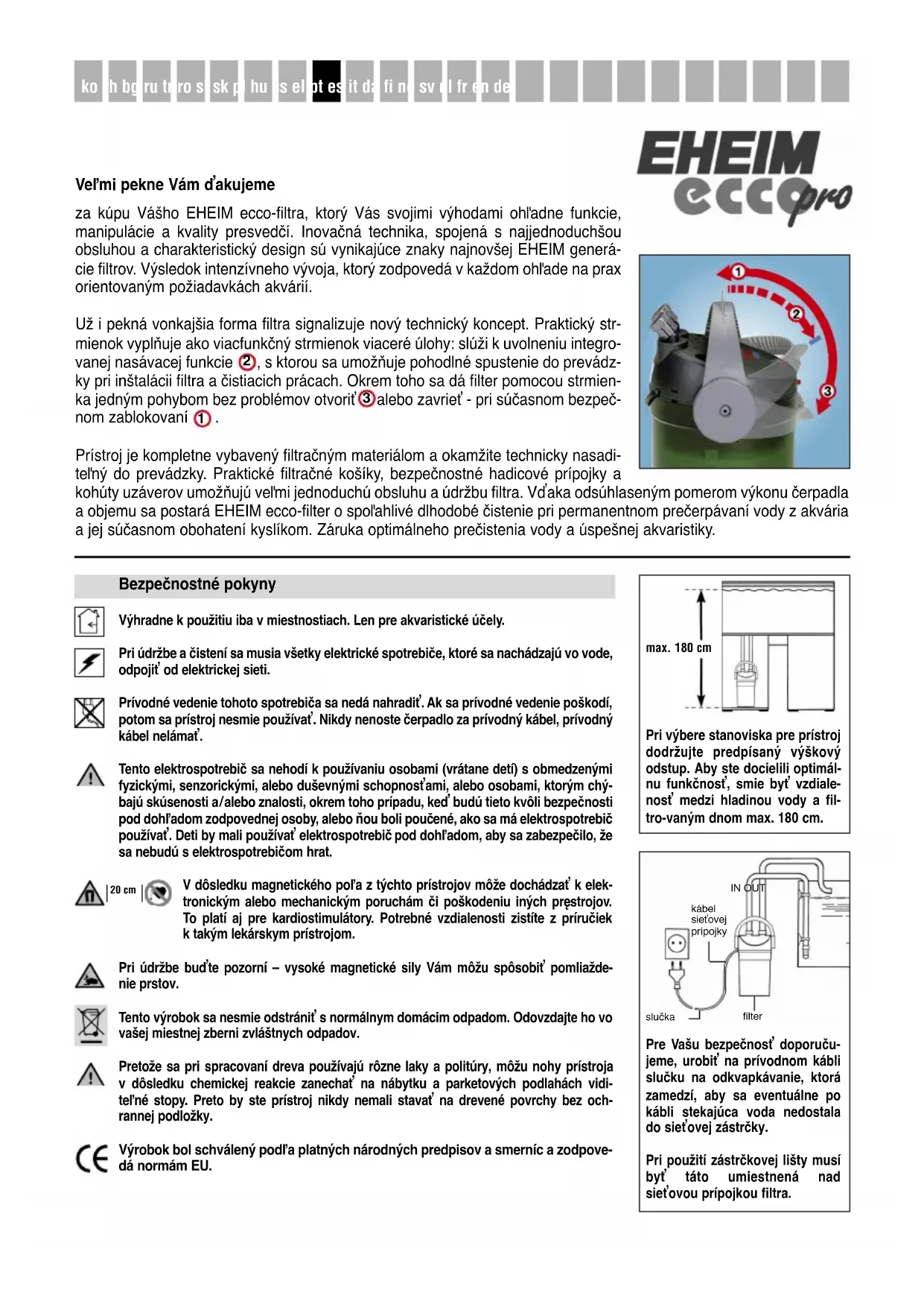 3Veľmi pekne Vám ďakujeme za kúpu Vášho EHEIM ecco-filtra, ktorý Vás svojimi výhodami ohľadne funkcie, manipulácie a kvality presvedčí. Inovačná technika, spojená s najjednoduchšou obsluhou a charakteristický design sú vynikajúce znaky najnovšej EHEIM generá- cie filtrov. Výsledok intenzívneho vývoja, ktorý zodpovedá v každom ohľade na prax orientovaným požiadavkách akvárií. Už i pekná vonkajšia forma filtra signalizuje nový technický koncept. Praktický str- mienok vyplňuje ako viacfunkčný strmienok viaceré úlohy: slúži k uvolneniu integro- vanej nasávacej funkcie , s ktorou sa umožňuje pohodlné spustenie do prevádz- ky pri inštalácii filtra a čistiacich prácach. Okrem toho sa dá filter pomocou strmien- ka jedným pohybom bez problémov otvoriť alebo zavrieť - pri súčasnom bezpeč- nom zablokovaní . Prístroj je kompletne vybavený filtračným materiálom a okamžite technicky nasadi- teľný do prevádzky. Praktické filtračné košíky, bezpečnostné hadicové prípojky a kohúty uzáverov umožňujú veľmi jednoduchú obsluhu a údržbu filtra. Vďaka odsúhlaseným pomerom výkonu čerpadla a objemu sa postará EHEIM ecco-filter o spoľahlivé dlhodobé čistenie pri permanentnom prečerpávaní vody z akvária a jej súčasnom obohatení kyslíkom. Záruka optimálneho prečistenia vody a úspešnej akvaristiky.