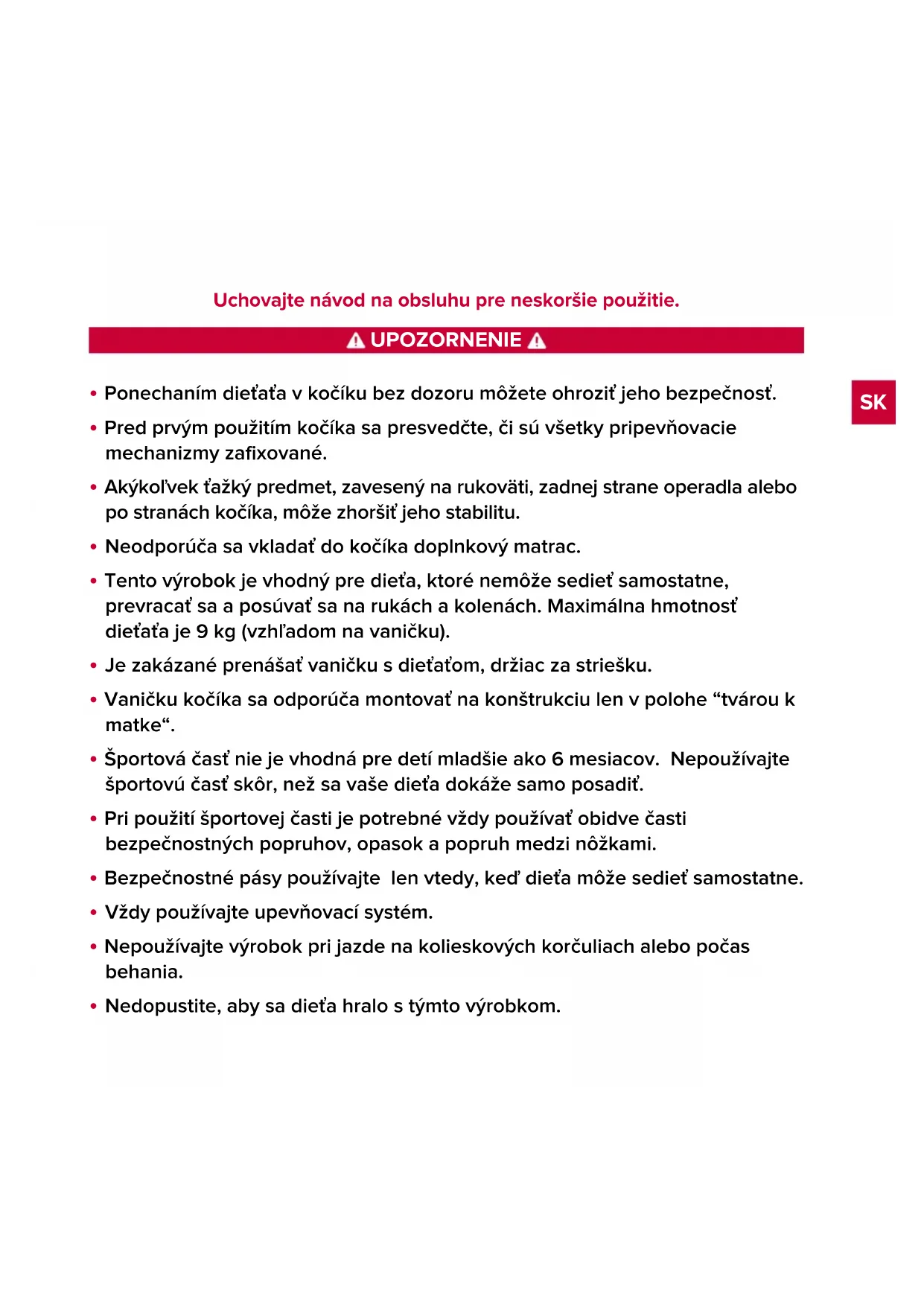 - Pred začatím použitia výrobku sa uistite, že pripevňovacie mechanizmy vaničky alebo športovej časti alebo autosedačky sú riadne zaklapnuté a namontované. Pred začatím použitia kočíka si pozorne preštudujte tento návod na obsluhu. V prípade nedodržania pokynov tohto návodu na obsluhu Vášmu dieťaťu môže hroziť nebezpečenstvo. Kočík je určený výlučne pre jedno dieťa. Kočík je určený pre detí od 0 do 36 mesiacov, ktoré majú hmotnosť menej ako 15 kg. Autosedačka môže byť použitá pre detí od 0 do 6 mesiacov, s hmotnosťou menej ako 13 kg. Tento výrobok je vhodný pre detí, ktoré ešte nemôžu sedieť samostatne, prevracať sa a plaziť sa. Ak sa autosedačka používa s podvozkom, potrebné je pamätať si, že kočík nenahradzuje kolísku alebo posteľ; ak dieťa chce spať, odporúča sa ho umiestňovať v príslušnej vaničke, kolíske alebo posteli. Kočík s dieťaťom nikdy nenechávajte stáť vo svahu, a to ani vtedy, keď sú brzdy zablokované. Brzdy majú byť zablokované, keď sa dieťa umiestňuje do kočíka alebo sa vyberá z neho. Je zakázané používať kočík, ak došlo k poškodeniu akéhokoľvek jeho dielu. Pred montážou kočíka je potrebné skontrolovať, či všetky jeho diely sú v správnom technickom stave; ak sú poškodené, kočík sa nesmie používať. Pri manipulácii s polohovateľnými prvkami kočíka dávajte pozor, aby pohyblivé diely neprichádzali do styku s časťami tela dieťaťa. Počas každého státia je nutné, aby kočík bol zabrzdený. Maximálne povolené zaťaženie rukoväte kočíka je 1 kg, maximálne povolené zaťaženie tašky činí 2 kg. Taška alebo akýkoľvek iný ťažký predmet zhoršuje stabilitu kočíka. Ku kočíku môžu byť používané len diely schválené výrobcom. Potrebné je používať len odporúčané alebo dodané výrobcom / distribútorom náhradné diely. Pri vchádzaní na obrubník alebo iný stupeň zdvíhnite predné kolesá kočíka. Neodporúča sa schádzať s kočíkom zo schodov. Nespúšťajte a nedvíhajte kočík po schodoch a iných šikmých plochách, kedy je dieťa v kočíku. Tlak v pneumatikách by nemal prevyšovať 0,8 bar. Podvozok môže sa používať spolu s vaničkou, športovou časťou a autosedačkou. Uchovávajte kočík mimo dosahu detí. UPOZORNENIEMONTÁŽ / DEMONTÁŽ