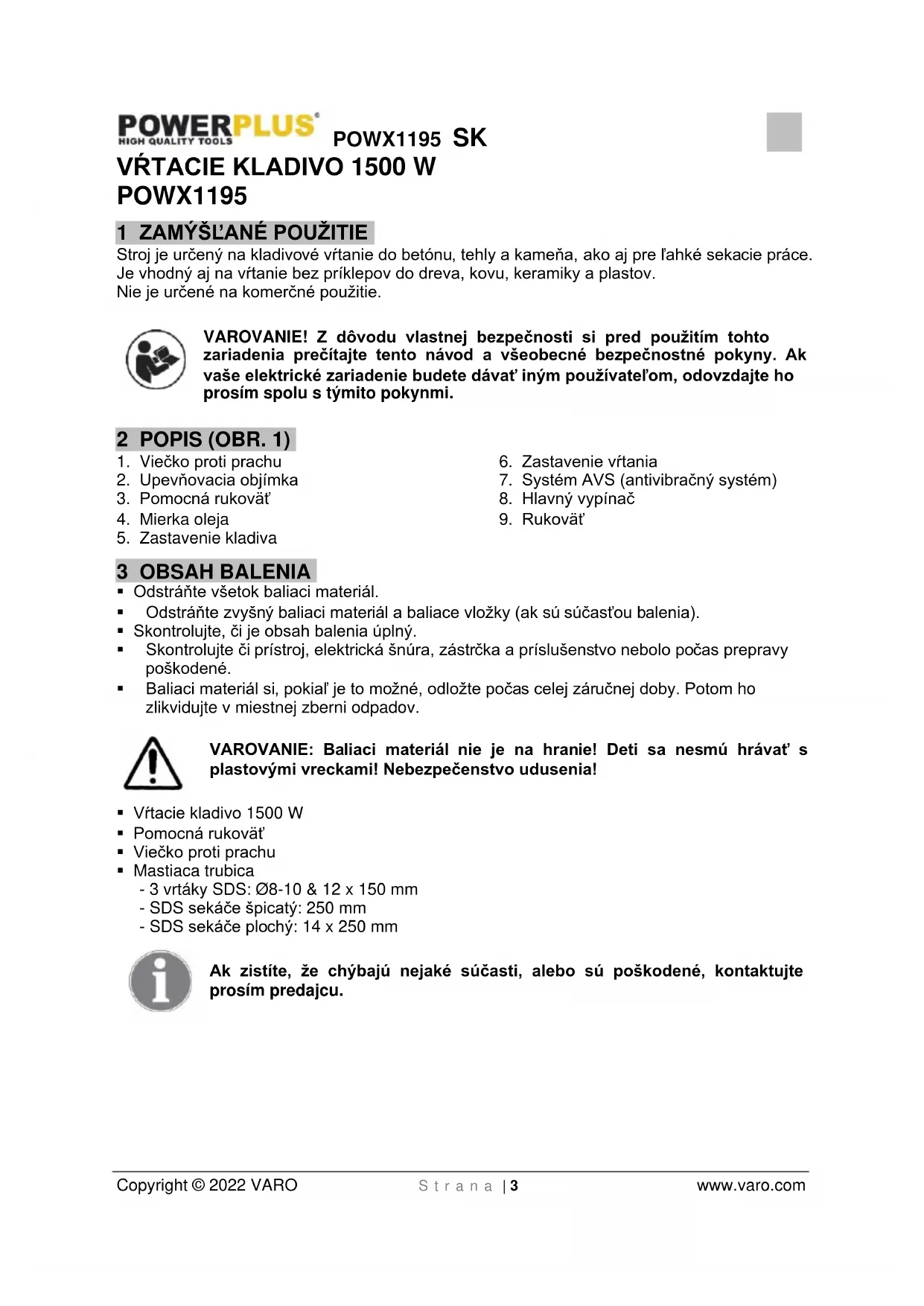 - Mastiaca trubica - 3 vrtáky SDS: Ø8-10 & 12 x 150 mm - SDS sekáče špicatý: 250 mm - SDS sekáče plochý: 14 x 250 mm Ak zistíte, že chýbajú nejaké súčasti, alebo sú poškodené, kontaktujte prosím predajcu.POWX1195 SK Copyright © 2022 VARO S t r a n a | 4 www.varo.com 4 SYMBOLY V tomto návode a/alebo na stroji sa používajú nasledujúce symboly:
