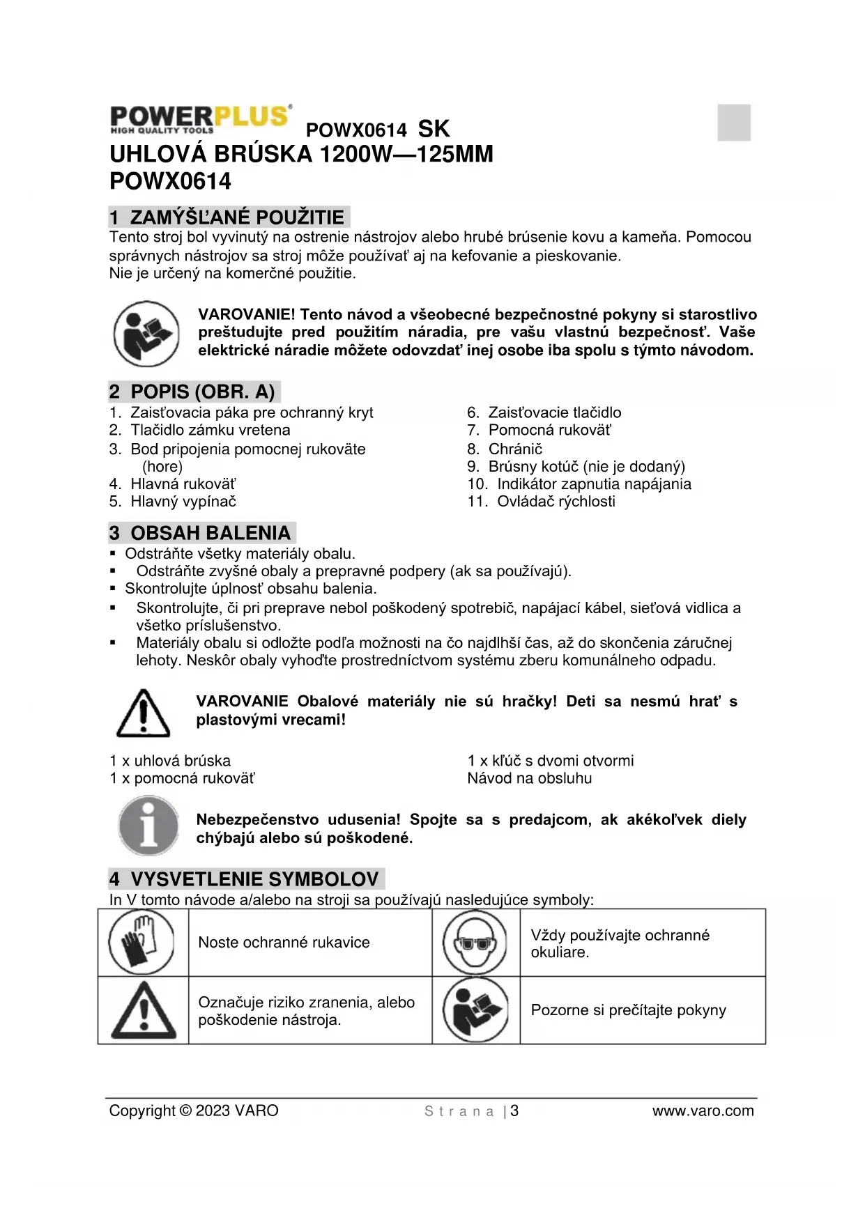 - Skontrolujte, či bol brúsny kotúč správne namontovaný a upevnený. Na správne upevnenie brúsneho kotúča nepoužívajte redukčné krúžky, ani adaptéry.POWX0614 SK Copyright © 2023 VARO S t r a n a | 6 www.varo.com