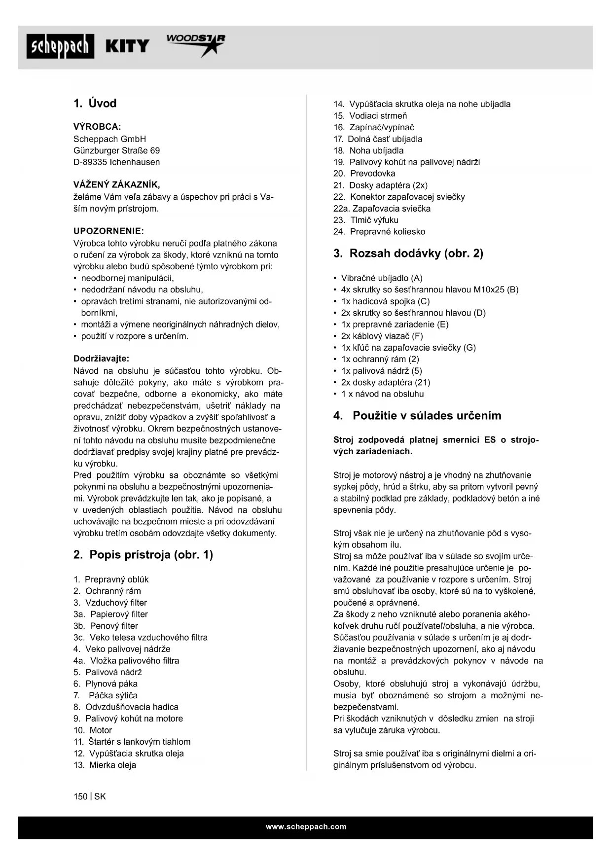 Stroj zodpovedá platnej smernici ES o strojo- vých zariadeniach. Stroj je motorový nástroj a je vhodný na zhutňovanie sypkej pôdy, hrúd a štrku, aby sa pritom vytvoril pevný a stabilný podklad pre základy, podkladový betón a iné spevnenia pôdy. Stroj však nie je určený na zhutňovanie pôd s vyso- kým obsahom ílu. Stroj sa môže používať iba v súlade so svojím urče- ním. Každé iné použitie presahujúce určenie je po- važované za používanie v rozpore s určením. Stroj smú obsluhovať iba osoby, ktoré sú na to vyškolené, poučené a oprávnené. Za škody z neho vzniknuté alebo poranenia akého- koľvek druhu ručí používateľ/obsluha, a nie výrobca. Súčasťou používania v súlade s určením je aj dodr- žiavanie bezpečnostných upozornení, ako aj návodu na montáž a prevádzkových pokynov v návode na obsluhu. Osoby, ktoré obsluhujú stroj a vykonávajú údržbu, musia byť oboznámené so strojom a možnými ne- bezpečenstvami. Pri škodách vzniknutých v dôsledku zmien na stroji sa vylučuje záruka výrobcu. Stroj sa smie používať iba s originálnymi dielmi a ori- ginálnym príslušenstvom od výrobcu.