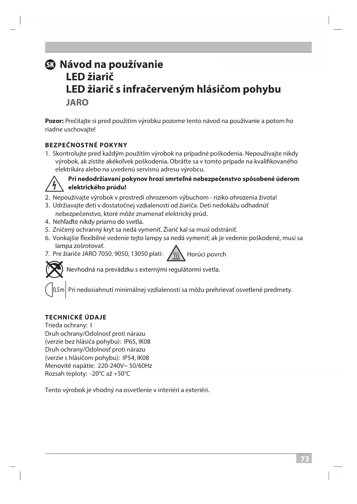 Horúci povrch Nevhodná na prevádzku s externými regulátormi svetla. Pri nedosiahnutí minimálnej vzdialenosti sa môžu prehrievať osvetlené predmety. TECHNICKÉ ÚDAJE Trieda ochrany: I Druh ochrany/Odolnosť proti nárazu (verzie bez hlásiča pohybu): IP65, IK08 Druh ochrany/Odolnosť proti nárazu (verzie s hlásičom pohybu): IP54, IK08 Menovité napätie: 220-240V~ 50/60Hz Rozsah teploty: -20°C až +50°C Tento výrobok je vhodný na osvetlenie v interiéri a exteriéri. 20P114 LED Strahler Jaro PIR 0533228 210327.indd 73 27.03.2021 16:10:547474 Návod na používanie JARO MONTÁŽ A PRIPOJENIE K NAPÁJANIU ELEKTRICKÝM PRÚDOM 10 – 50 W pozri obrázky strana 4, 7 a 8