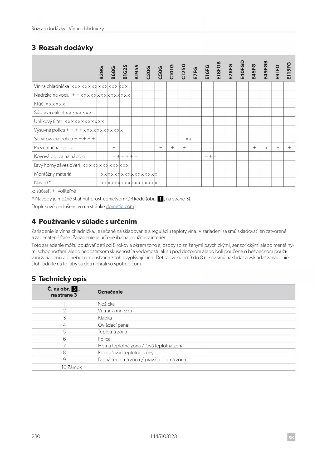 3 Rozsah dodávky B29G B68G B162S B195S C20G C50G C101G C125G E7FG E16FG E18FGB E28FG E40FGD E45FG E49FGB E91FG E115FG Vínnachladnička x x x x x x x x x x x x x x x x x Nádržkanavodu + + x x x x x x x x x x x x x x x Kľúč x x x x x x Súprava etikiet x x x x x x x x Uhlíkovýlter x x x x x x x x x x x x Výsuvná polica + + + + x x x x x x x x x x x x Servírovacia polica + + + + + x x Prezentačnápolica + + + + + x + + Kovovápolicananápoje + + + + + + + + + Ľavýhornýzávesdverí x x x x x x x x x x x x x x Montážnymateriál x x x x x x x x x x x x x x x x x Návod* x x x x x x x x x x x x x x x x x x:súčasť,+:voliteľné *NávodyjemožnéstiahnuťprostredníctvomQRkódu(obr. ,nastrane3). Doplnkovépríslušenstvonastránke dometic.com. 4 Používanie vsúlade surčením Zariadeniejevínnachladnička.Jeurčenénaskladovanieareguláciuteplotyvína.Vzariadenísasmúskladovaťlenzatvorené azapečatenéfľaše.Zariadeniejeurčenéibanapoužitievinteriéri. Totozariadeniemôžupoužívaťdetiod8rokovaokremtohoajosobysozníženýmipsychickými,senzorickýmialebomentálny- mischopnosťamialebonedostatkomskúsenostíavedomostí,aksúpoddozoromalebobolipoučenéobezpečnompouží- vanízariadeniaaonebezpečenstváchztohovyplývajúcich.Detivovekuod3do8rokovsmúnakladaťavykladaťzariadenie. Dohliadnitenato,abysadetinehralisospotrebičom. 5 Technický opis Č. naobr. , nastrane 3 Označenie 1 Nožička 2 Vetraciamriežka 3 Klapka 4 Ovládací panel 5 Teplotná zóna 6 Polica 7 Hornáteplotnázóna/ľaváteplotnázóna 8 Rozdeľovačteplotnejzóny 9 Dolná teplotná zóna / pravá teplotná zóna 10 Zámok4445103123 231 Vínnechladničky Technickýopis