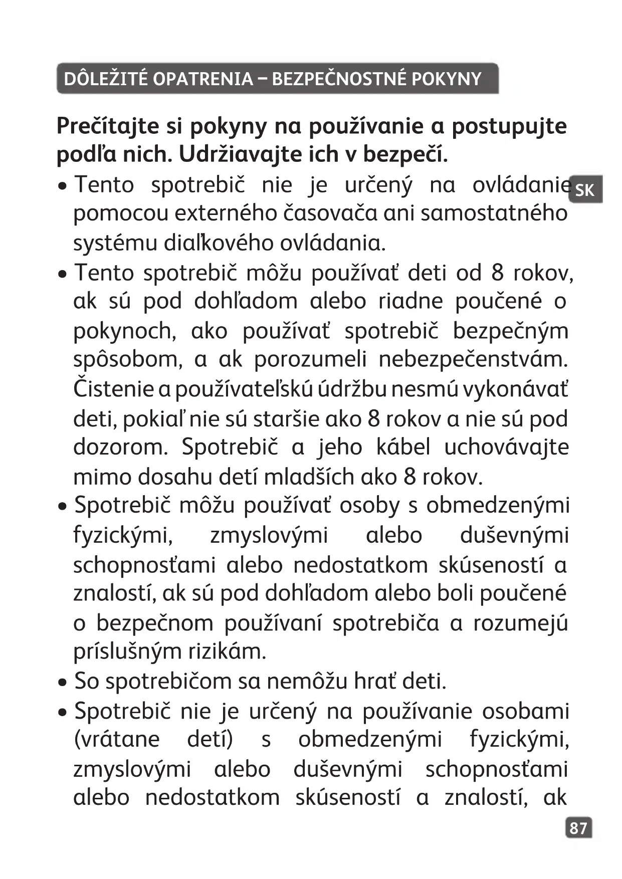 - Spotrebič nie je určený na používanie osobami (vrátane detí) s obmedzenými fyzickými, zmyslovými alebo duševnými schopnosťami alebo nedostatkom skúseností a znalostí, akSK