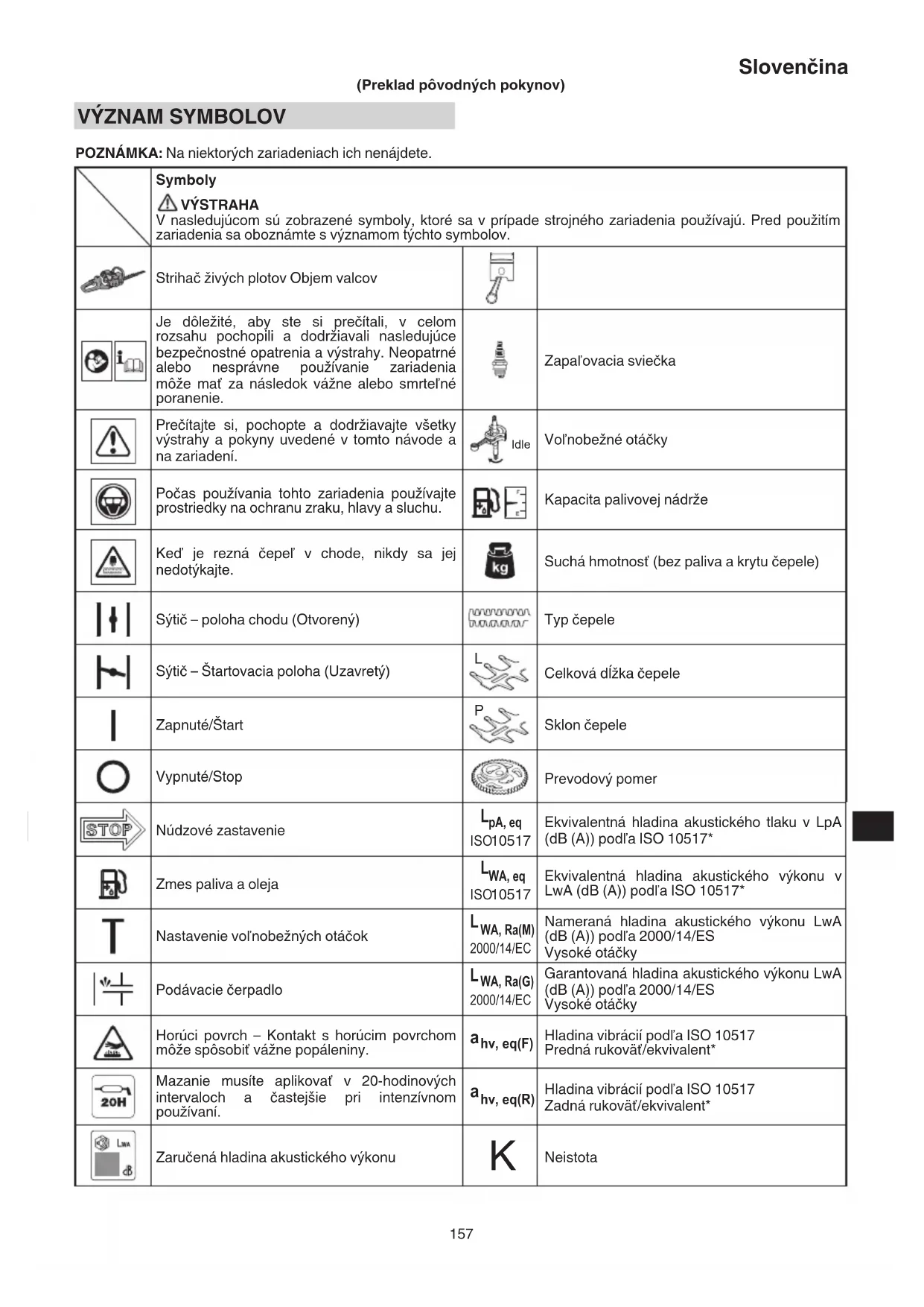 POZNÁMKA: Na niektorých zariadeniach ich nenájdete. Symboly VÝSTRAHA V nasledujúcom sú zobrazené symboly, ktoré sa v prípade strojného zariadenia používajú. Pred použitím zariadenia sa oboznámte s významom týchto symbolov. Strihač živých plotov Objem valcov Je dôležité, aby ste si prečítali, v celom rozsahu pochopili a dodržiavali nasledujúce bezpečnostné opatrenia a výstrahy. Neopatrné alebo nesprávne používanie zariadenia môže mať za následok vážne alebo smrteľné poranenie. Zapaľovacia sviečka Prečítajte si, pochopte a dodržiavajte všetky výstrahy a pokyny uvedené v tomto návode a na zariadení. Idle Voľnobežné otáčky Počas používania tohto zariadenia používajte prostriedky na ochranu zraku, hlavy a sluchu. Kapacita palivovej nádrže Keď je rezná čepeľ v chode, nikdy sa jej nedotýkajte. Suchá hmotnosť (bez paliva a krytu čepele) Sýtič – poloha chodu (Otvorený) Typ čepele Sýtič – Štartovacia poloha (Uzavretý)