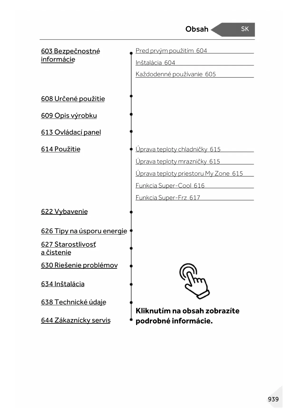 Pred prvým použitím 604 Inštalácia 604 Každodenné používanie 605 608 Určené použitie 609 Opis výrobku 613 Ovládací panel 614 Použitie Úprava teploty chladničky 615 Úprava teploty mrazničky 615 Úprava teploty priestoru My Zone 615 Funkcia Super-Cool 616 Funkcia Super-Frz 617 622 Vybavenie 626 Tipy na úsporu energie 627 Starostlivosť a čistenie 630 Riešenie problémov 634 Inštalácia 638 Technické údaje Kliknutím na obsah zobrazíte podrobné informácie. 644 Zákaznícky servisĎakujeme