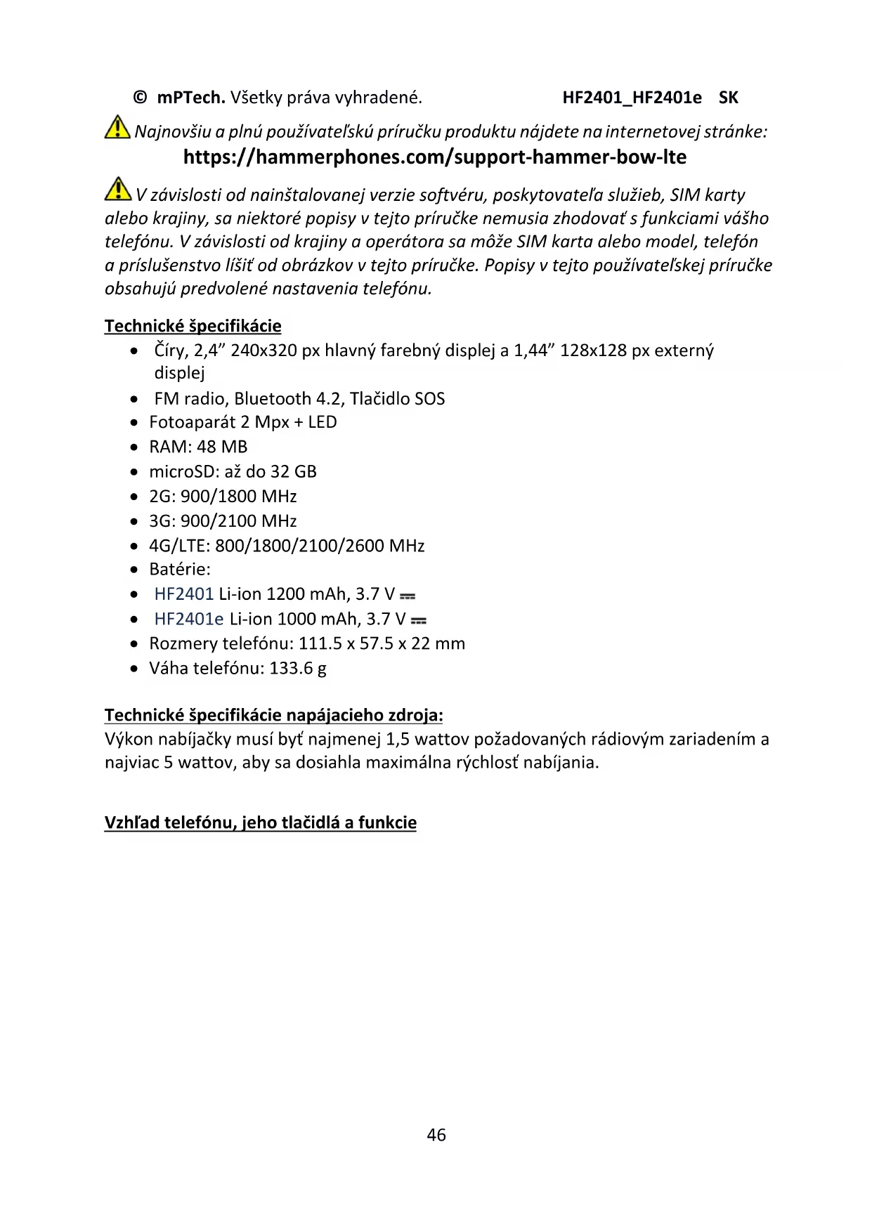 Najnovšiu a plnú používateľskú príručku produktu nájdete na internetovej stránke: https://hammerphones.com/support-hammer-bow-lte V závislosti od nainštalovanej verzie softvéru, poskytovateľa služieb, SIM karty alebo krajiny, sa niektoré popisy v tejto príručke nemusia zhodovať s funkciami vášho telefónu. V závislosti od krajiny a operátora sa môže SIM karta alebo model, telefón a príslušenstvo líšiť od obrázkov v tejto príručke. Popisy v tejto používateľskej príručke obsahujú predvolené nastavenia telefónu. Technické špecifikácie