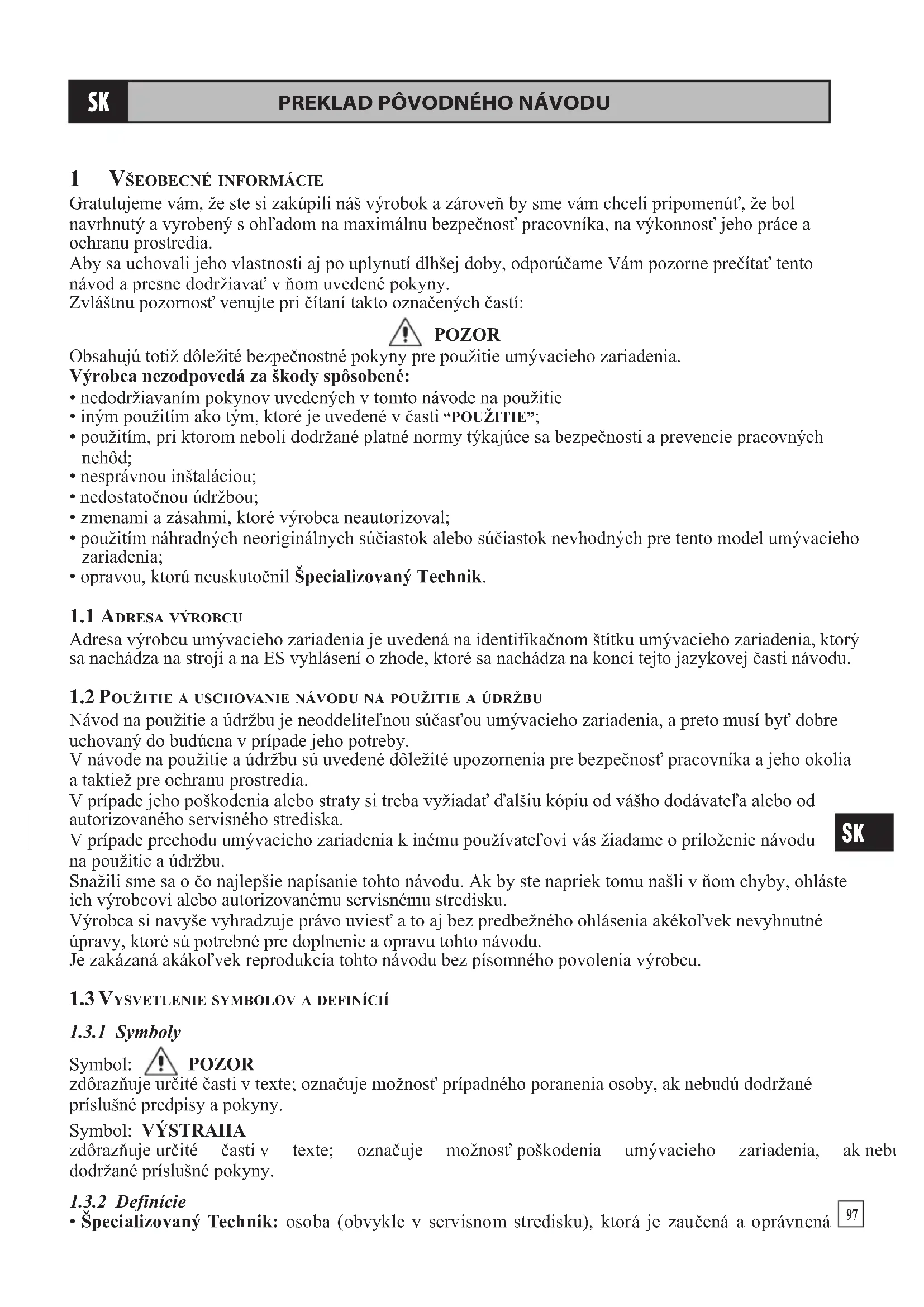 - Aby bola zarucena bezpečnost umyvacieho zariadenia použivajte len originálne nahradné suciastky, ktoré dodal vyrobca alebo suciastky, ktoré vyrobca odporucil.