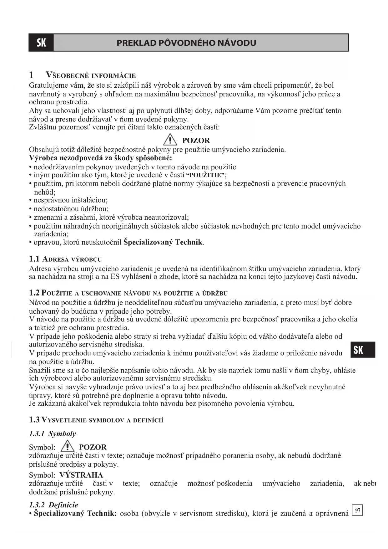 zdoraznju ercité casti v texte; označujemeznost poškodenia umyvacieho zariadenia, ak nebu doržanje prislušnéPokyny.