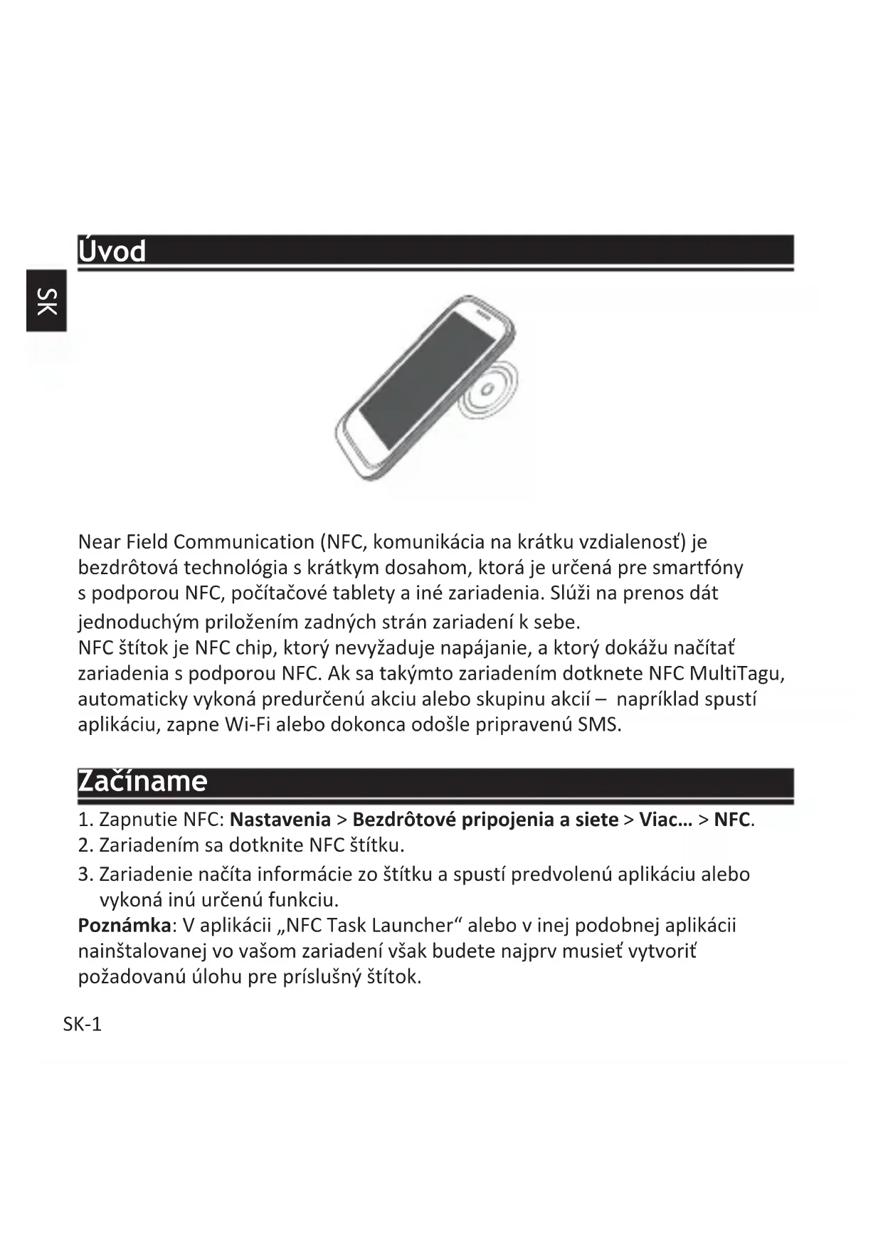 vykoná inú určenú funkciu. Poznámka: V aplikácii „NFC Task Launcher“ alebo v inej podobnej aplikácii nainštalovanej vo vašom zariadení však budete najprv musieť vytvoriť požadovanú úlohu pre príslušný štítok.SK SK-2 Príklady Príklad 1: Režim použitia na nočnom stolíku V aplikácii „NFC Task Launcher“ zadefinujte úlohu pre štítok na nočnom stolíku: napr. aktivácia tichého režimu, otvorenie aplikácie na zobrazovanie hodín, nastavenie budíka, vypnutie Wi-Fi a pod. Dotykom tohto NFC štítku môžete telefón rýchlo prepnúť do nastaveného „nočného“ režimu bez toho, aby ste museli meniť všetky nastavenia ručne. Príklad 2: Režim použitia v domácnostiSK-3