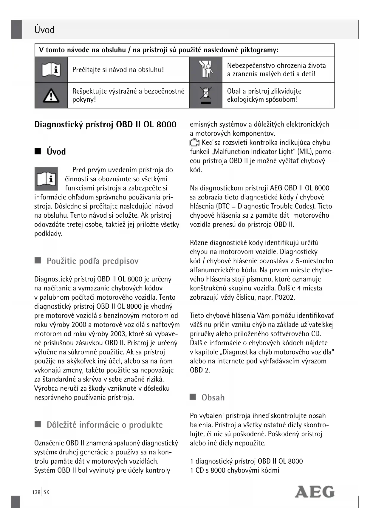 Zobrazení se mohou nepatrne lišit od vzhledu výrobku. Zmeny v popisu provedené z duvodu technického vývoje výrobku jsou vyhrazeny. Dekorace není v obsahu.136137 SK Obsah Úvod Použitie podľa predpisov ....................................................................................................................... Strana 138 Dôležité informácie o produkte .......................................................................................................... Strana 138 Obsah ........................................................................................................................................................... Strana 138 Popis častí .................................................................................................................................................. Strana 139 Technické údaje ........................................................................................................................................ Strana 139 Bezpečnosť Všeobecné bezpečnostné predpisy ..................................................................................................... Strana 139 Uvedenie do činnosti / Obsluha Analýza chybových kódov ..................................................................................................................... Strana 140 Načítanie chybových kódov ................................................................................................................. Strana 141 Spustenie diagnostiky chýb .................................................................................................................. Strana 141 Vyvolanie funkcií menu ......................................................................................................................... Strana 141 Vymazanie diagnostických chybových kódov ................................................................................. Strana 142 Funkcia menu kontrolný program / výfukový systém ................................................................... Strana 142 Načítanie funkcie menu pre identifikačné číslo vozidla (VIN) .................................................. Strana 143 Funkcia menu nového snímania ......................................................................................................... Strana 143 Diagnostická chyba vozidla (DTC – Diagnostic Fault Code), inštalácia CD ............................ Strana 143 Údržba a ošetrovanie ...................................................................................................................... Strana 144 Servis ............................................................................................................................................................. Strana 144 Záruka .......................................................................................................................................................... Strana 144 Likvidácia ................................................................................................................................................... Strana 144 Konformita ............................................................................................................................................... Strana 144 Zoznam chybových kódov ............................................................................................................ Strana 145138 SK Diagnostický prístroj OBD II OL 8000 Úvod Pred prvým uvedením prístroja do činnosti sa oboznámte so všetkými funkciami prístroja azabezpečte si informácie ohľadom správneho používania prí- stroja. Dôsledne si prečítajte nasledujúci návod na obsluhu. Tento návod si odložte. Ak prístroj odovzdáte tretej osobe, taktiež jej priložte všetky podklady. Použitie podľa predpisov Diagnostický prístroj OBD II OL 8000 je určený na načítanie avymazanie chybových kódov vpalubnom počítači motorového vozidla. Tento diagnostický prístroj OBD II OL 8000 je vhodný pre motorové vozidlá sbenzínovým motorom od roku výroby 2000 a motorové vozidlá snaftovým motorom od roku výroby 2003, ktoré sú vybave- né príslušnou zásuvkou OBD II. Prístroj je určený výlučne na súkromné použitie. Ak sa prístroj použije na akýkoľvek iný účel, alebo sa na ňom vykonajú zmeny, takéto použitie sa nepovažuje za štandardné askrýva vsebe značné riziká. Výrobca neručí za škody vzniknuté vdôsledku nesprávneho používania prístroja. Dôležité informácie o produkte Označenie OBD II znamená »palubný diagnostický systém« druhej generácie apoužíva sa na kon- trolu pamäte dát vmotorových vozidlách. Systém OBD II bol vyvinutý pre účely kontroly emisných systémov adôležitých elektronických amotorových komponentov. Keď sa rozsvieti kontrolka indikujúca chybu funkcií „Malfunction Indicator Light“ (MIL), pomo- cou prístroja OBD II je možné vyčítať chybový kód. Na diagnostickom prístroji AEG OBD II OL 8000 sa zobrazia tieto diagnostické kódy / chybové hlásenia (DTC = Diagnostic Trouble Codes). Tieto chybové hlásenia sa zpamäte dát motorového vozidla prenesú do prístroja OBD II. Rôzne diagnostické kódy identifikujú určitú chybu na motorovom vozidle. Diagnostický kód / chybové hlásenie pozostáva z5-miestneho alfanumerického kódu. Na prvom mieste chybo- vého hlásenia stojí písmeno, ktoré oznamuje konštrukčnú skupinu vozidla. Ďalšie 4 miesta zobrazujú vždy číslicu, napr. P0202. Tieto chybové hlásenia Vám pomôžu identifikovať väčšinu príčin vzniku chýb na základe užívateľskej príručky alebo priloženého softvérového CD. Ďalšie informácie ochybových kódoch nájdete vkapitole „Diagnostika chýb motorového vozidla“ alebo na internete pod vyhľadávacím výrazom OBD 2. Obsah Po vybalení prístroja ihneď skontrolujte obsah balenia. Prístro
