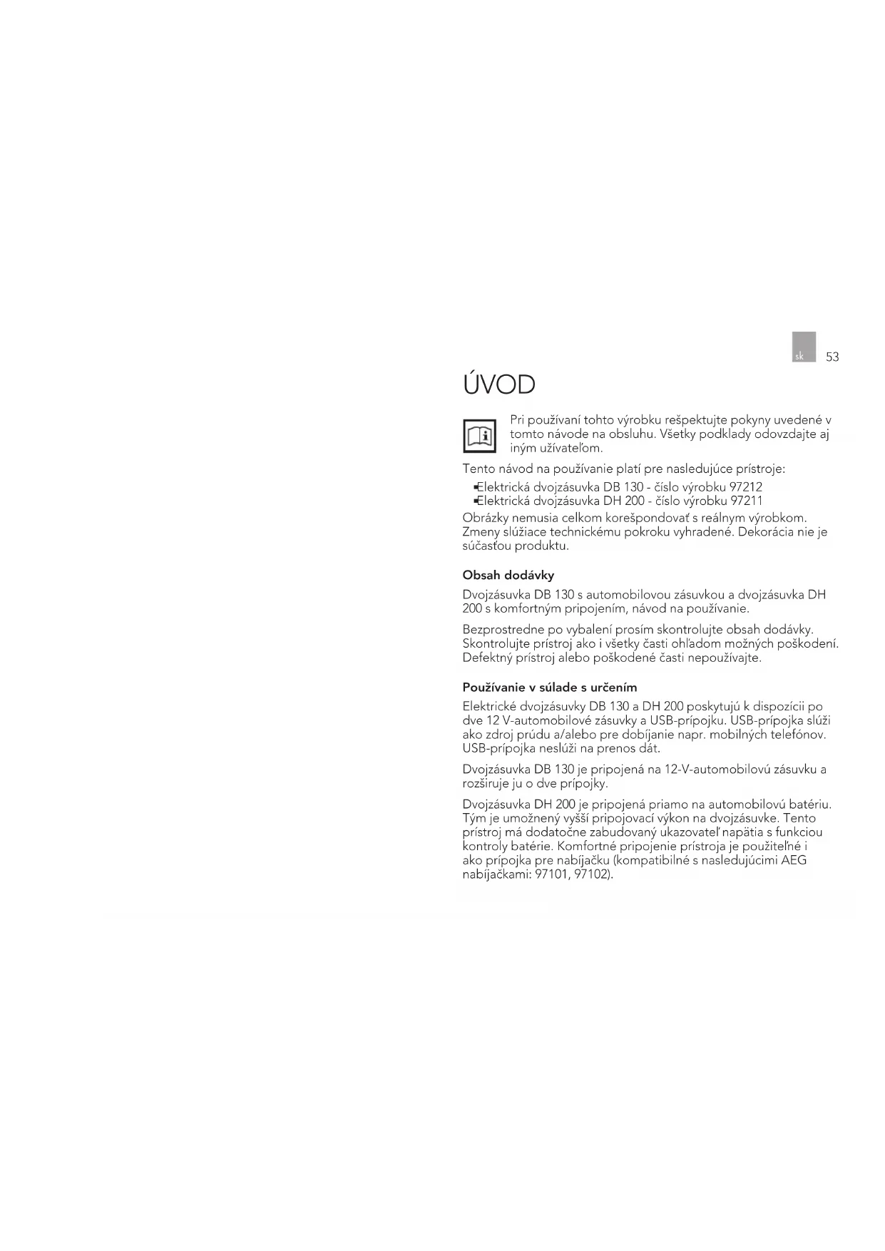 Elektrická dvojzásuvka DH 200 - číslo výrobku 97211 Obrázky nemusia celkom korešpondovať s reálnym výrobkom. Zmeny slúžiace technickému pokroku vyhradené. Dekorácia nie je súčasťou produktu. Obsah dodávky Dvojzásuvka DB 130 s automobilovou zásuvkou a dvojzásuvka DH 200 s komfortným pripojením, návod na používanie. Bezprostredne po vybalení prosím skontrolujte obsah dodávky. Skontrolujte prístroj ako i všetky časti ohľadom možných poškodení. Defektný prístroj alebo poškodené časti nepoužívajte. Používanie v súlade s určením Elektrické dvojzásuvky DB 130 a DH 200 poskytujú k dispozícii po dve 12 V-automobilové zásuvky a USB-prípojku. USB-prípojka slúži ako zdroj prúdu a/alebo pre dobíjanie napr. mobilných telefónov. USB-prípojka neslúži na prenos dát. Dvojzásuvka DB 130 je pripojená na 12-V-automobilovú zásuvku a rozširuje ju o dve prípojky. Dvojzásuvka DH 200 je pripojená priamo na automobilovú batériu. Tým je umožnený vyšší pripojovací výkon na dvojzásuvke. Tento prístroj má dodatočne zabudovaný ukazovateľ napätia s funkciou kontroly batérie. Komfortné pripojenie prístroja je použiteľné i ako prípojka pre nabíjačku (kompatibilné s nasledujúcimi AEG nabíjačkami: 97101, 97102).5554