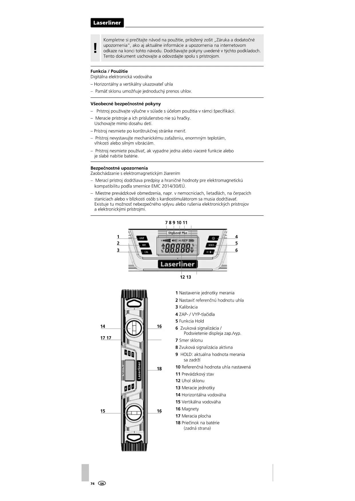 1 Nastavenie jednotky merania 2 Nastaviť referenčnú hodnotu uhla 3 Kalibrácia 4 ZAP- / VYP-tlačidla 5 Funkcia Hold 6 Zvuková signalizácia / Podsvietenie displeja zap./vyp. 7 Smer sklonu 8 Zvuková signalizácia aktívna 9 HOLD: aktuálna hodnota merania sa zadrží 10 Referenčná hodnota uhla nastavená 11 Prevádzkový stav 12 Uhol sklonu 13 Meracie jednotky 14 Horizontálna vodováha 15 Vertikálna vodováha 16 Magnety 17 Meracia plocha 18 Priečinok na batérie (zadná strana)DigiLevel Plus