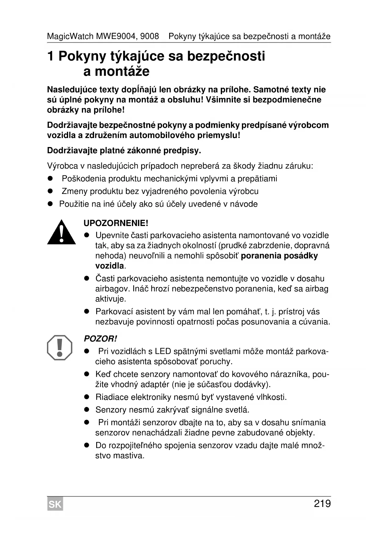 UPOZORNENIE! Upevnite časti parkovacieho asistenta namontované vo vozidle tak, aby sa za žiadnych okolností (prudké zabrzdenie, dopravná nehoda) neuvoľnili a nemohli spôsobiť poranenia posádky vozidla. Časti parkovacieho asistenta nemontujte vo vozidle v dosahu airbagov. Ináč hrozí nebezpečenstvo poranenia, keď sa airbag aktivuje. Parkovací asistent by vám mal len pomáhať, t. j. prístroj vás nezbavuje povinnosti opatrnosti počas posunovania a cúvania.