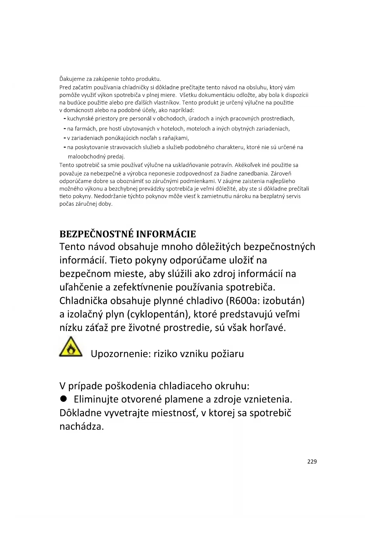 Tento návod obsahuje mnoho dôležitých bezpečnostných informácií. Tieto pokyny odporúčame uložiť na bezpečnom mieste, aby slúžili ako zdroj informácií na uľahčenie a zefektívnenie používania spotrebiča. Chladnička obsahuje plynné chladivo (R600a: izobután) a izolačný plyn (cyklopentán), ktoré predstavujú veľmi nízku záťaž pre životné prostredie, sú však horľavé. Upozornenie: riziko vzniku požiaru V prípade poškodenia chladiaceho okruhu: Eliminujte otvorené plamene a zdroje vznietenia. Dôkladne vyvetrajte miestnosť, v ktorej sa spotrebič nachádza. Percentuálna doba chodu:230